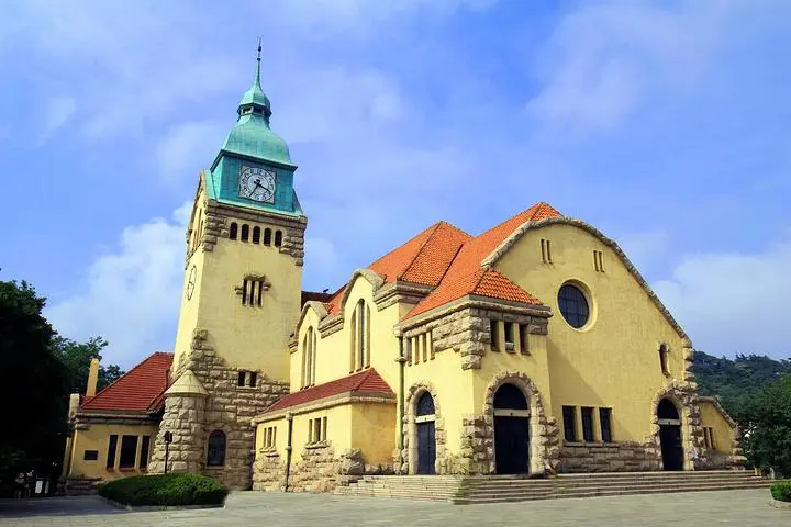 沿江苏路可走到江苏路【基督教堂】〔教堂始建于1908年为德国古堡式建筑,塔楼百年钟表至今仍可准确报时,门票10元〕