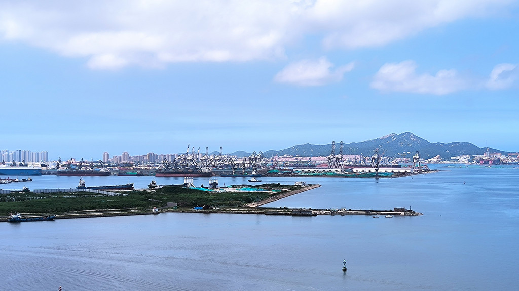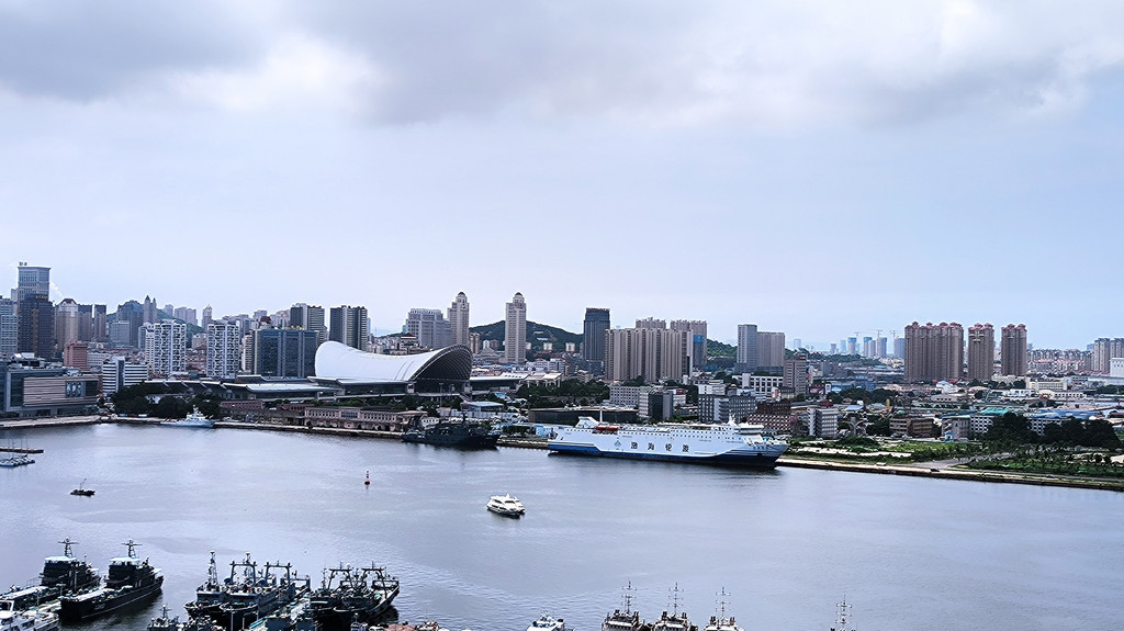 登山灯塔远眺繁忙的烟台港,远处马鞍形建筑就是烟台火车站。