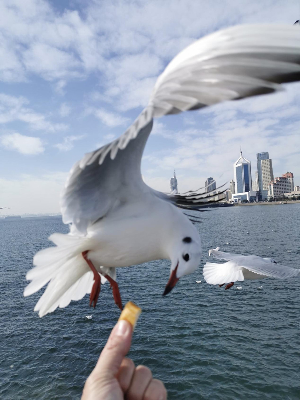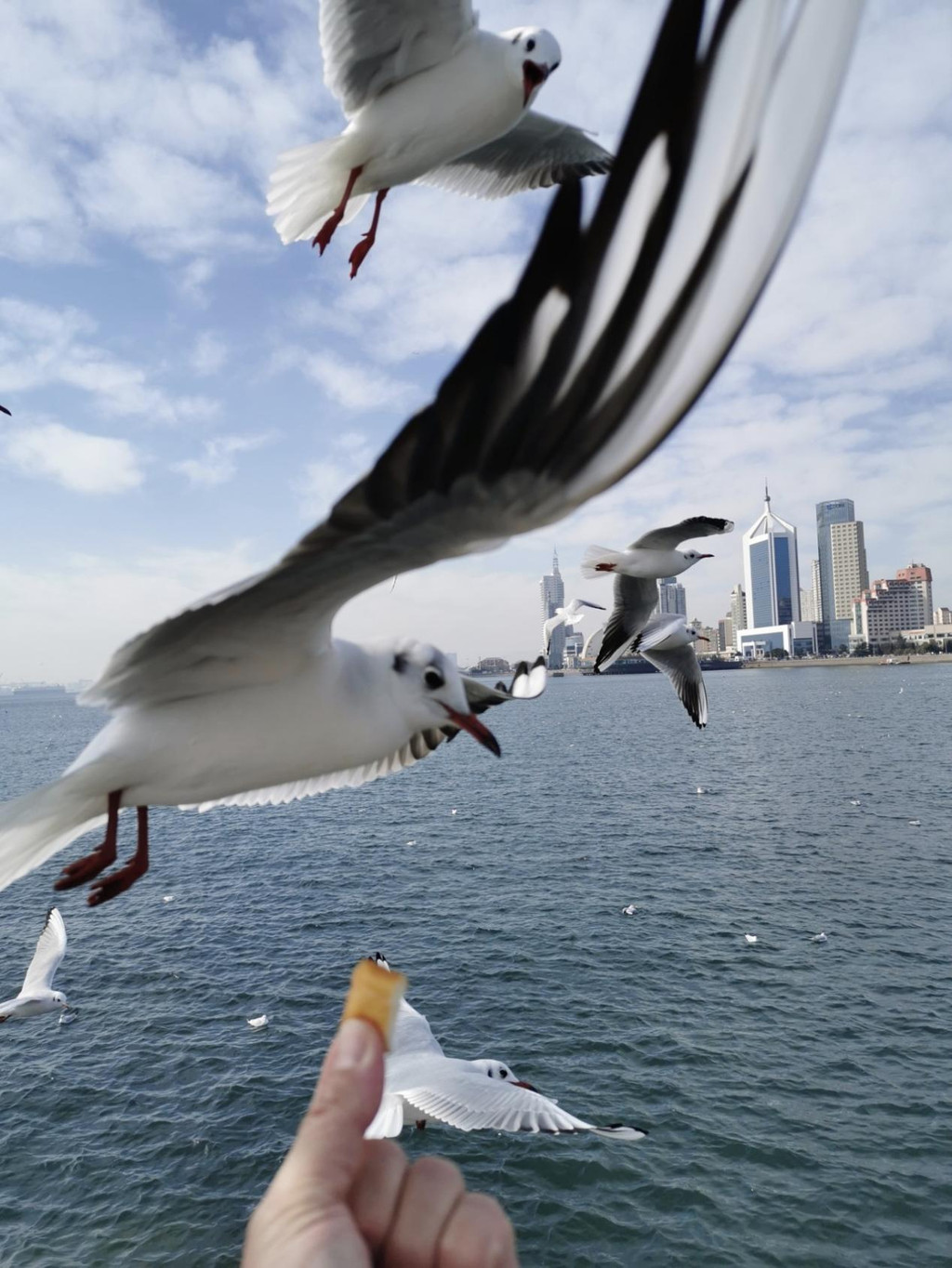 我觉得我实在是太生猛了,拿着油条就让海鸥吃起来了。一个手机拍照,一个手机喂海鸥。看到了近距离的海鸥,很好看,眼睛瞪得圆圆的。特别萌。