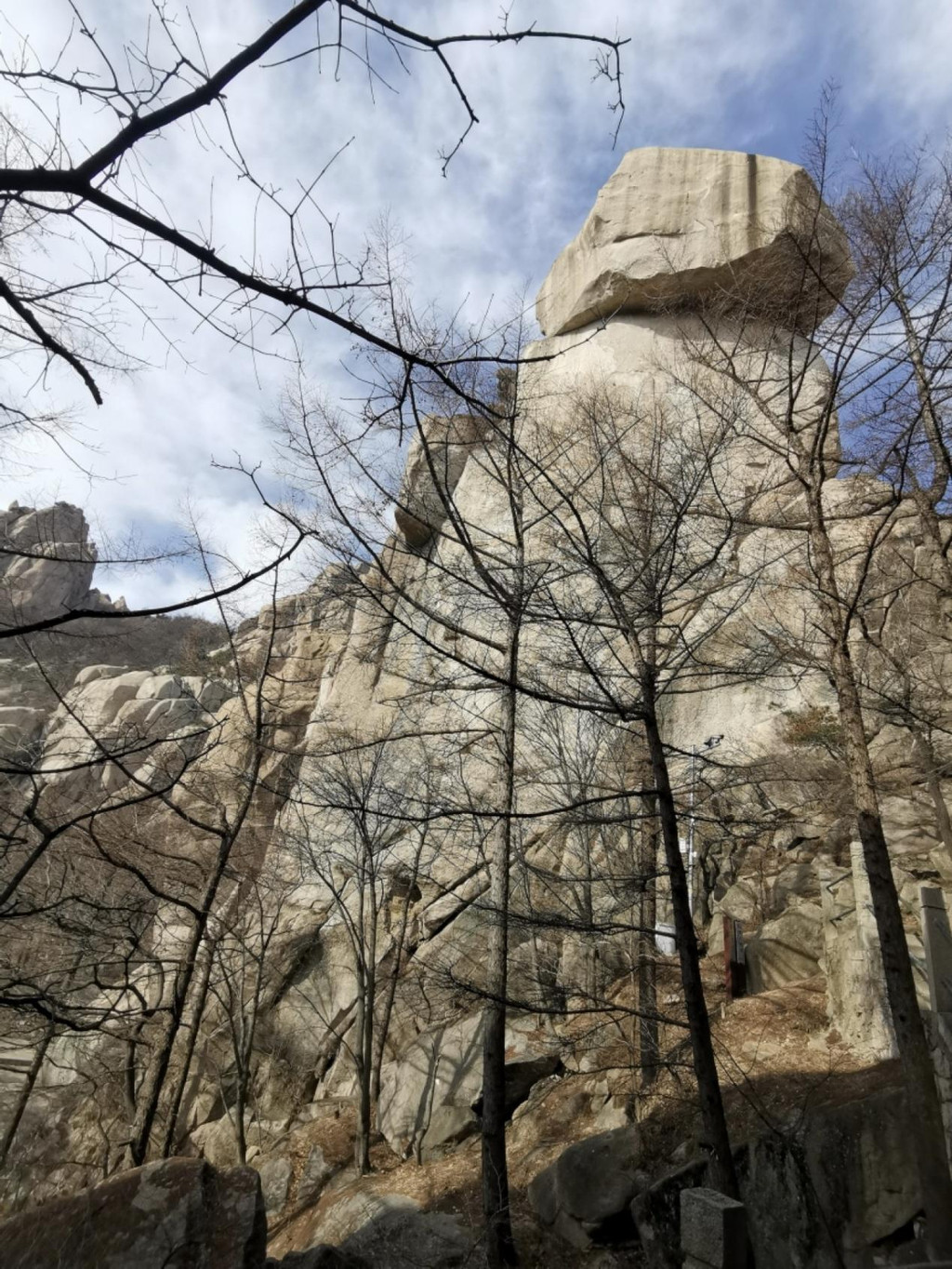 爬到山上之后我们就开始各种暴走了。现在的崂山就是石头大集合。天气太冷了,山上所有树木的叶子都掉了。不过,这时候旅行也有一个显而易见的好处,就是可以看到山石本来的面貌。原来山峰也是千沟万壑的。整个山体看上去也有不少小石头。