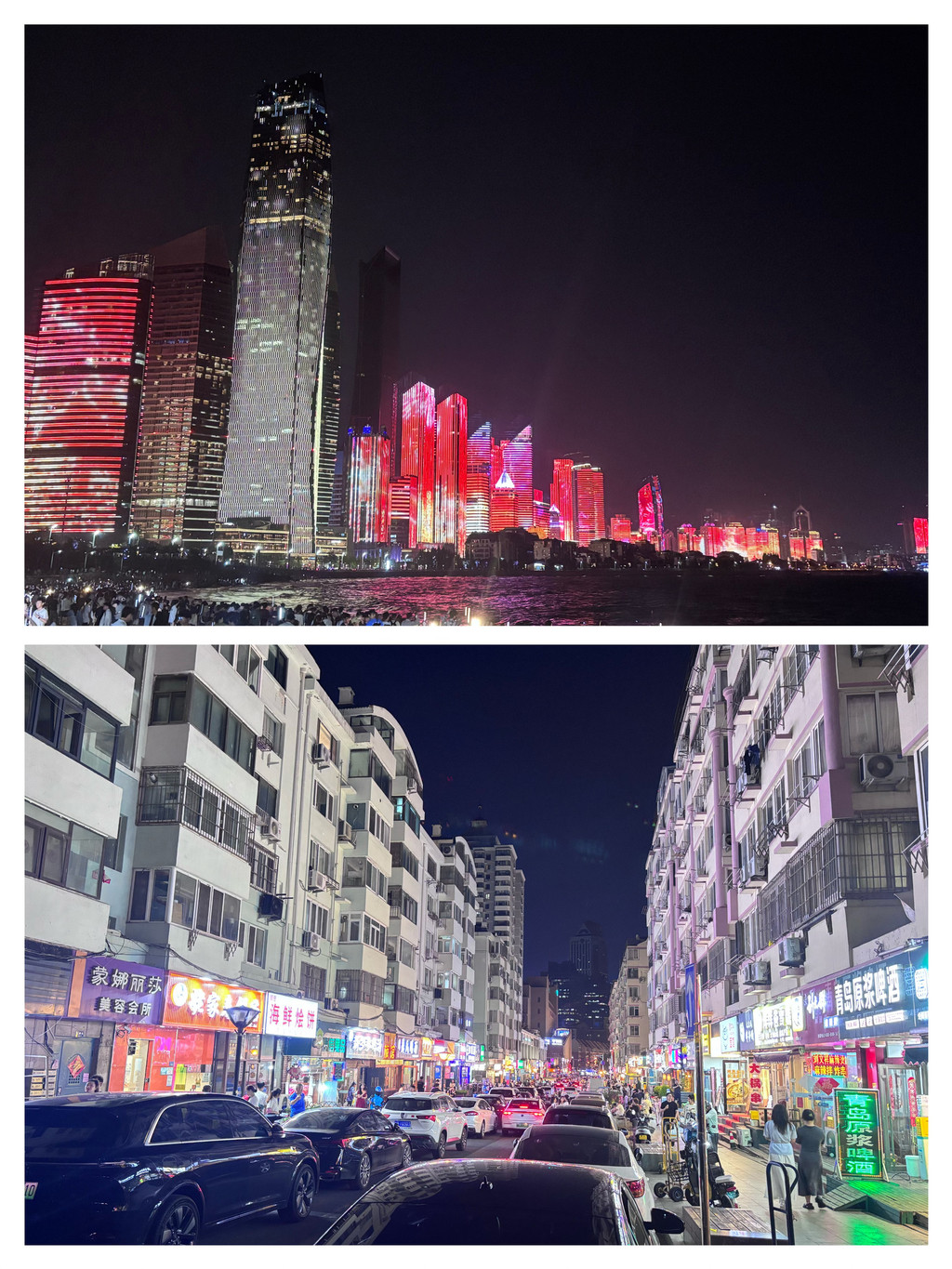 由于特殊的地理位置,青岛这座海滨城市的夜晚很美。从 <青岛第三水浴场> 开始往北,沿海的高楼会在天黑后开起灯光秀。