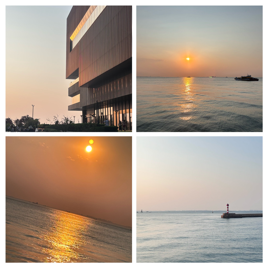 青岛有一个海湾,朝西,金茂湾朝着这片水域,便提供了一处看日落的最佳位置。近处的海水轻轻拍打岸边,远处却像静止一般。几艘船停驻在海面,装点着夕阳映射在水中的倒影。