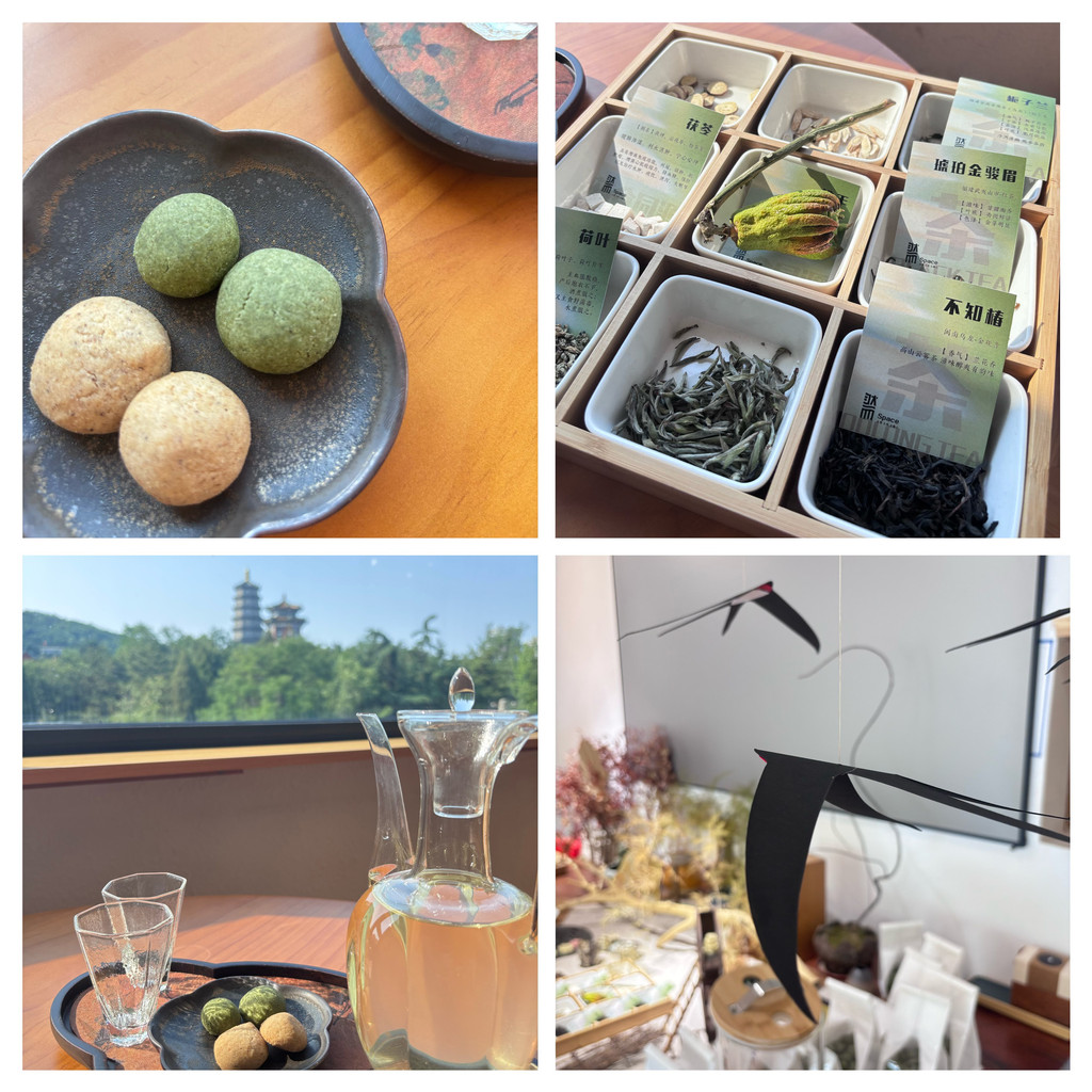 他家茶的出品更受年轻人喜欢,茶点也是手工制作,含有中药成分,比如佛手柑和茯苓。玻璃窗外正对着湛山寺,能够看到药师塔。 喝一口茶,吃一口茶点,下午茶就应该这样清幽宁静。