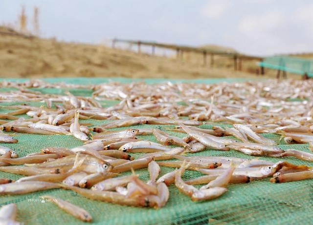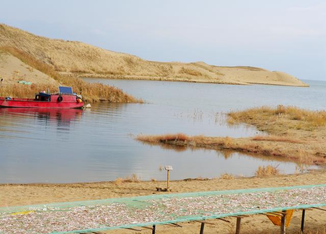 一半是湖水,一半是沙漠,龙羊峡沙漠,黄色的细沙,深蓝的湖水,渔民们在沙漠上晾晒鱼干,打鱼的木船在湖中停靠,一派和谐景象。