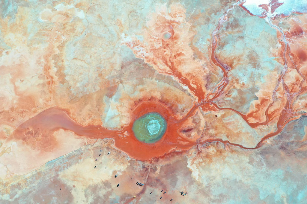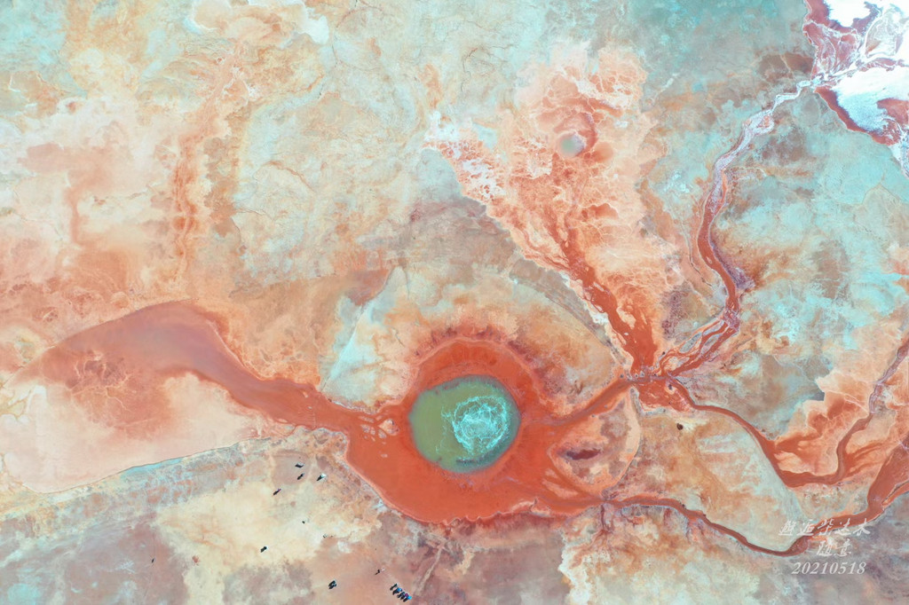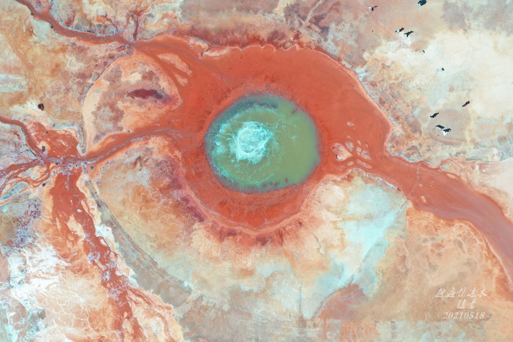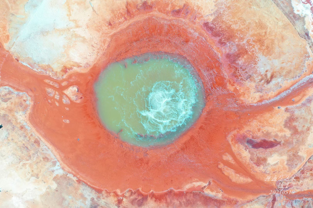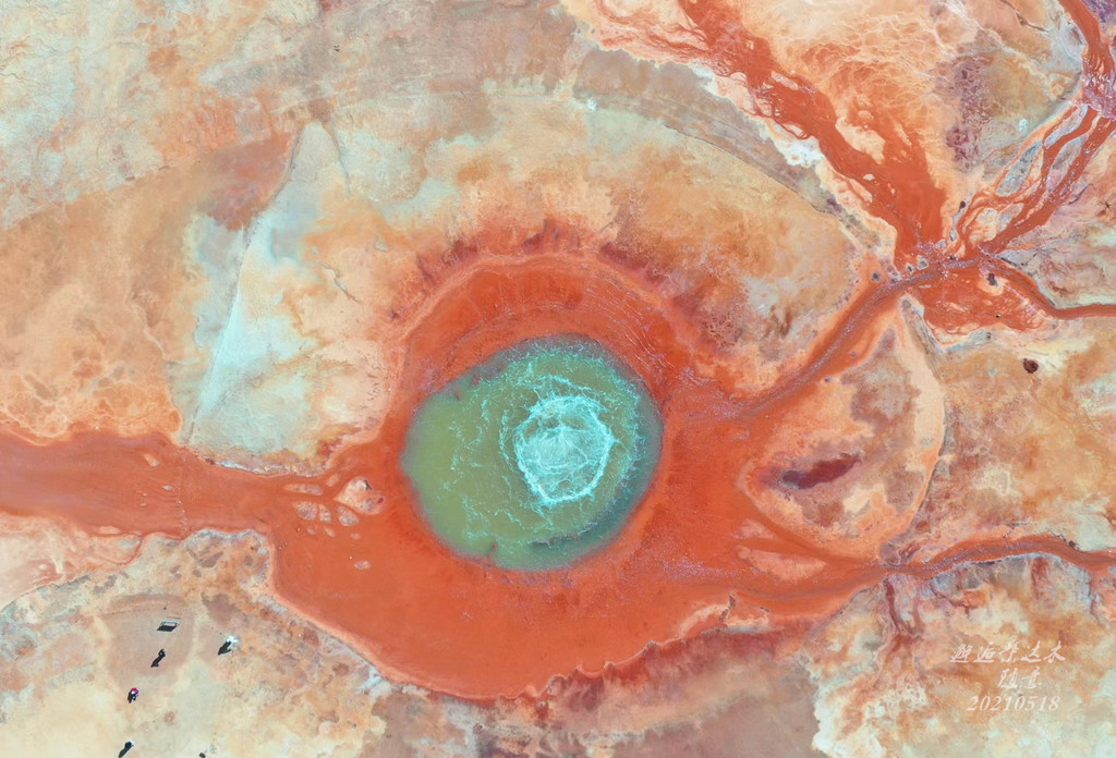 艾肯泉又被称为“大地之眼”、“恶魔之眼”,直径也不过10多米,泉眼如同沸腾的开水,不断翻滚上涌,泉眼周围硫磺矿物质长期沉淀,色彩斑斓,组成一个奇特的瞳孔造型,仿佛一只镶嵌在大地上的眼睛。这是我们一路来看过最为奇特的风景,但从陆地上基本看不出什么,必须航拍。我们在艾肯泉旁租上无人机