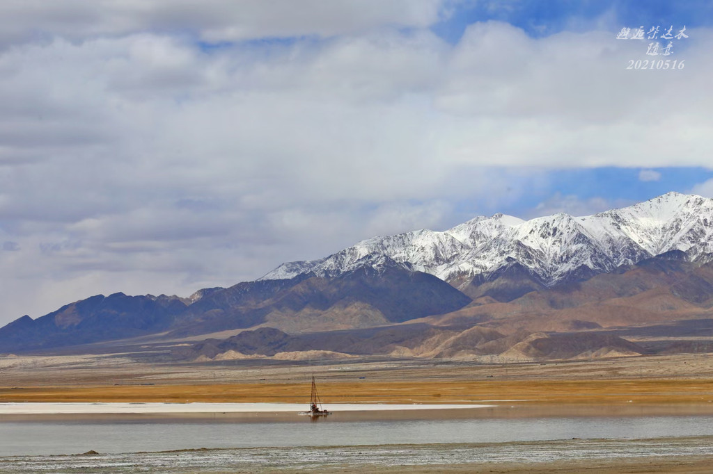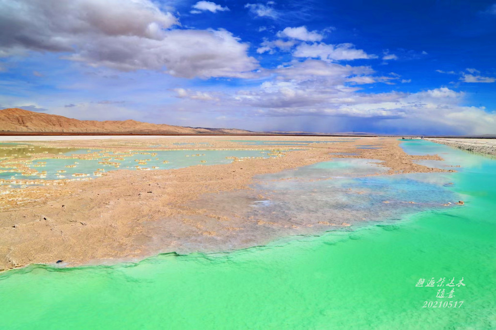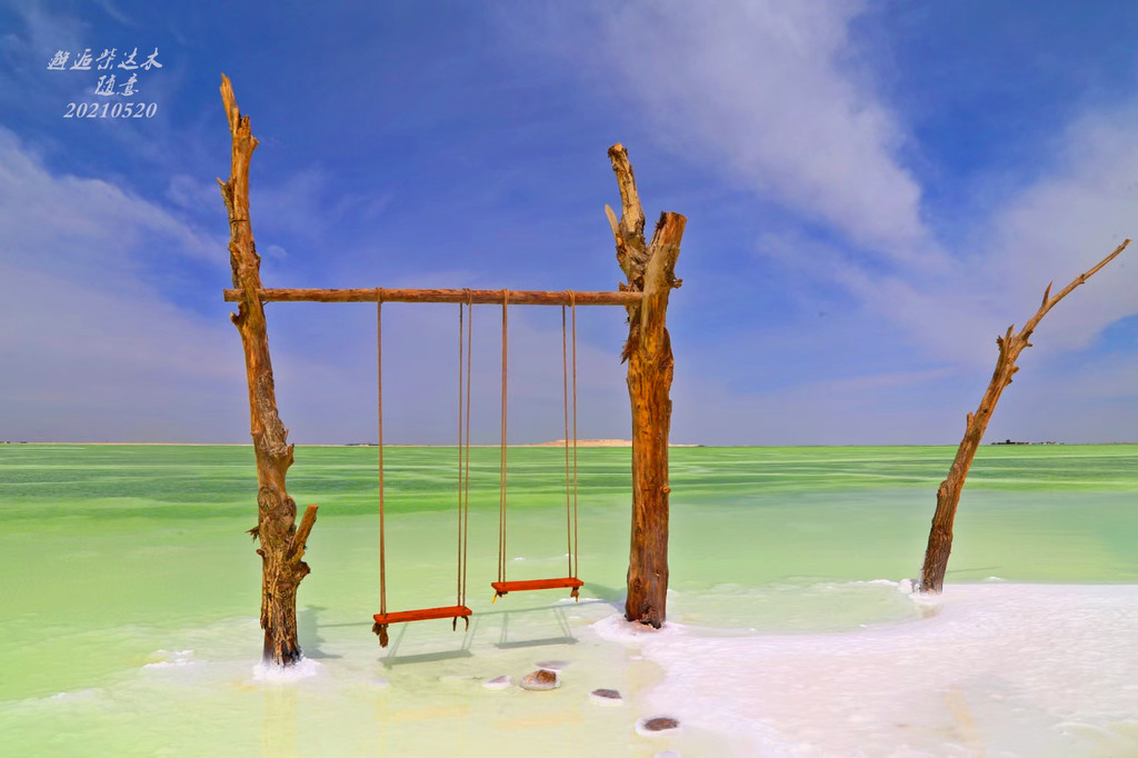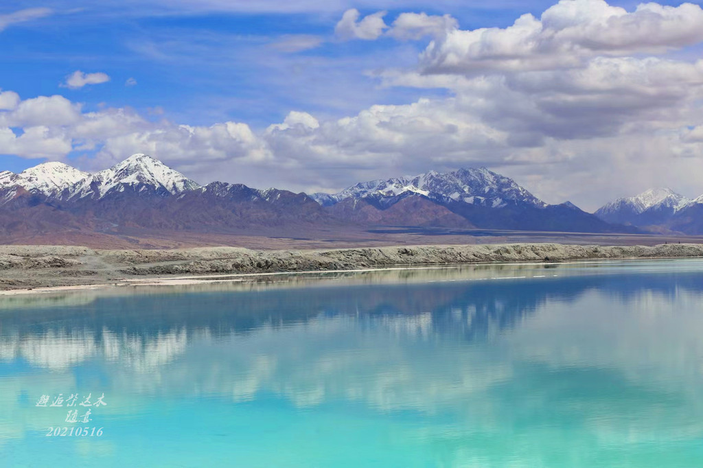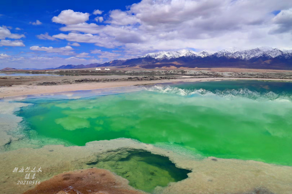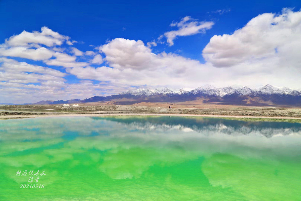 翡翠湖在风平浪静的时候,湖水宛若镜面般的散布在四处,水里倒影着蓝天白云和柴达木山的皑皑雪峰,景色赛过茶卡盐湖,美得令人窒息,只有身在其间才能深刻感受