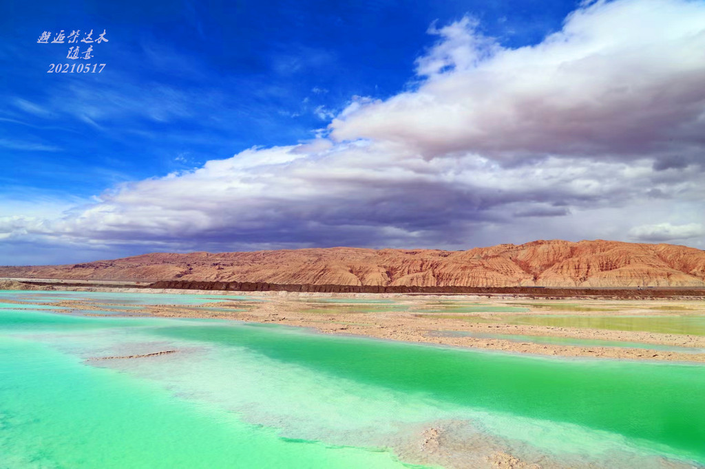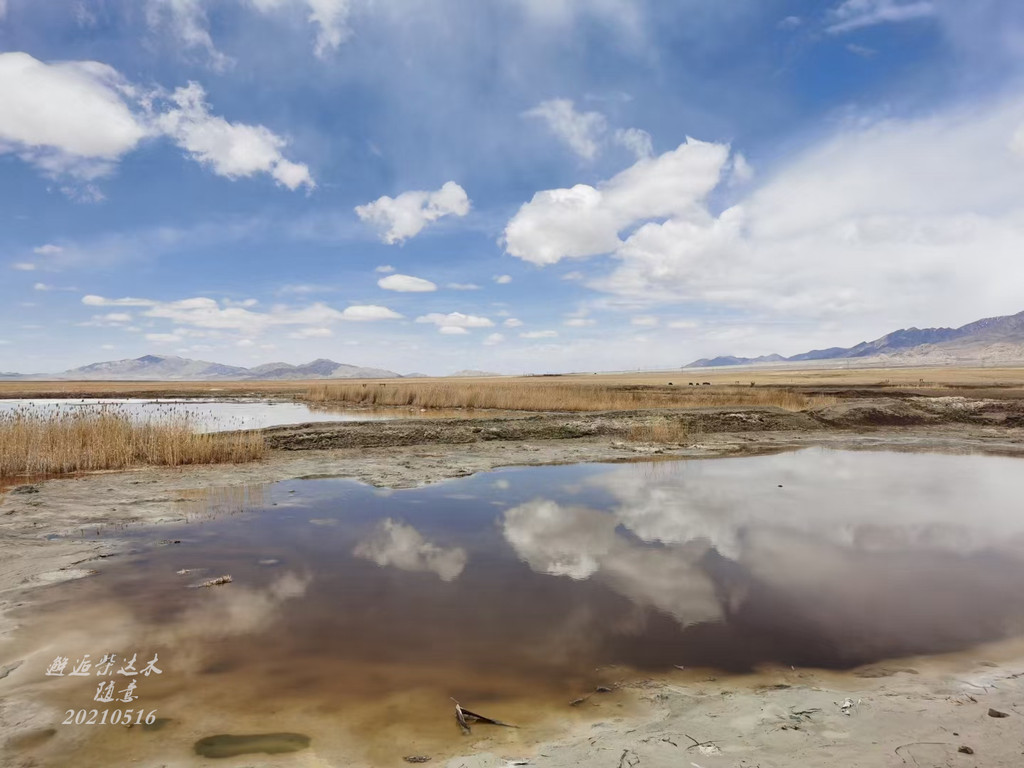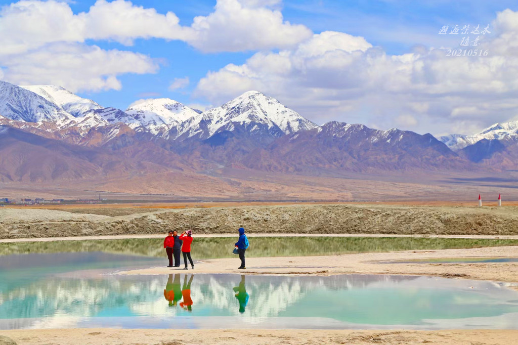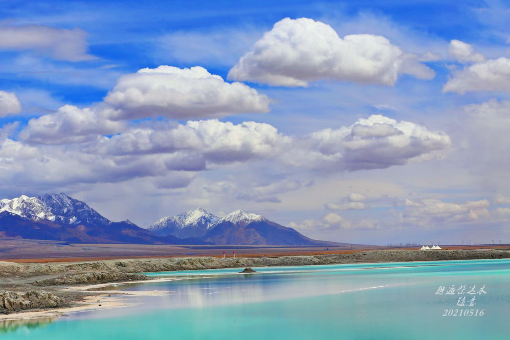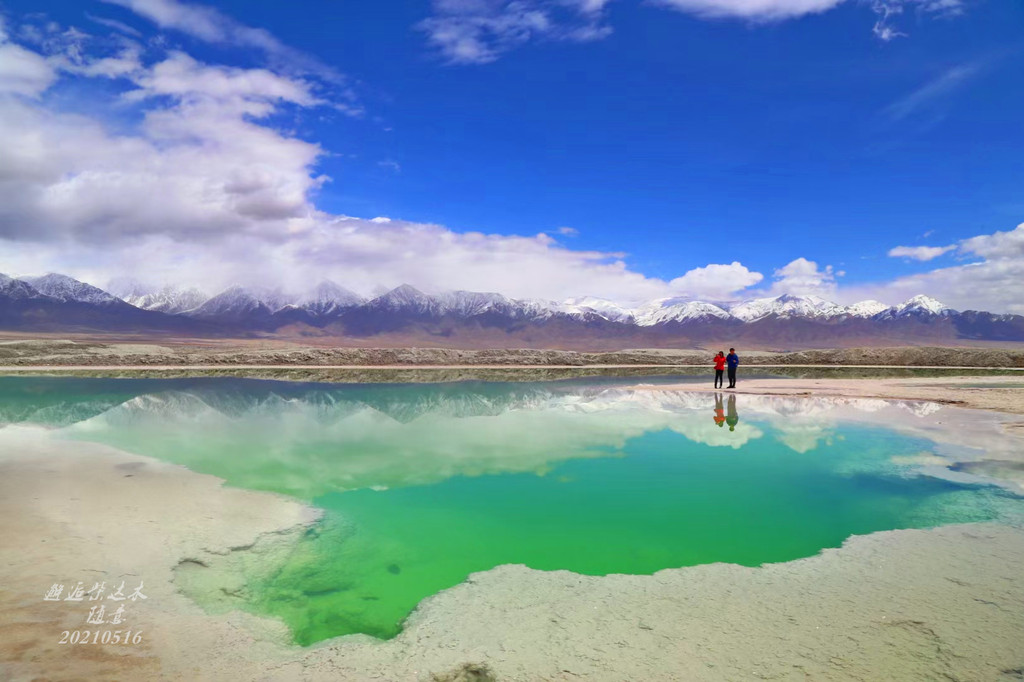 翡翠湖在风平浪静的时候,湖水宛若镜面般的散布在四处,水里倒影着蓝天白云和柴达木山的皑皑雪峰,景色赛过茶卡盐湖,美得令人窒息,只有身在其间才能深刻感受