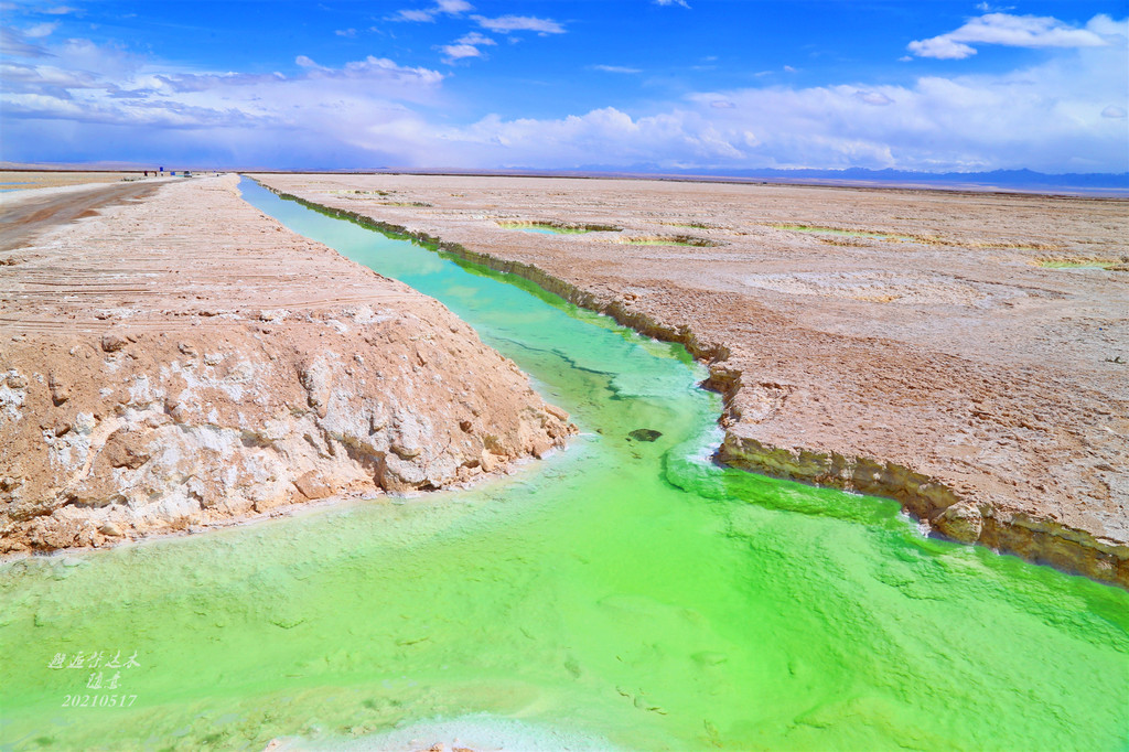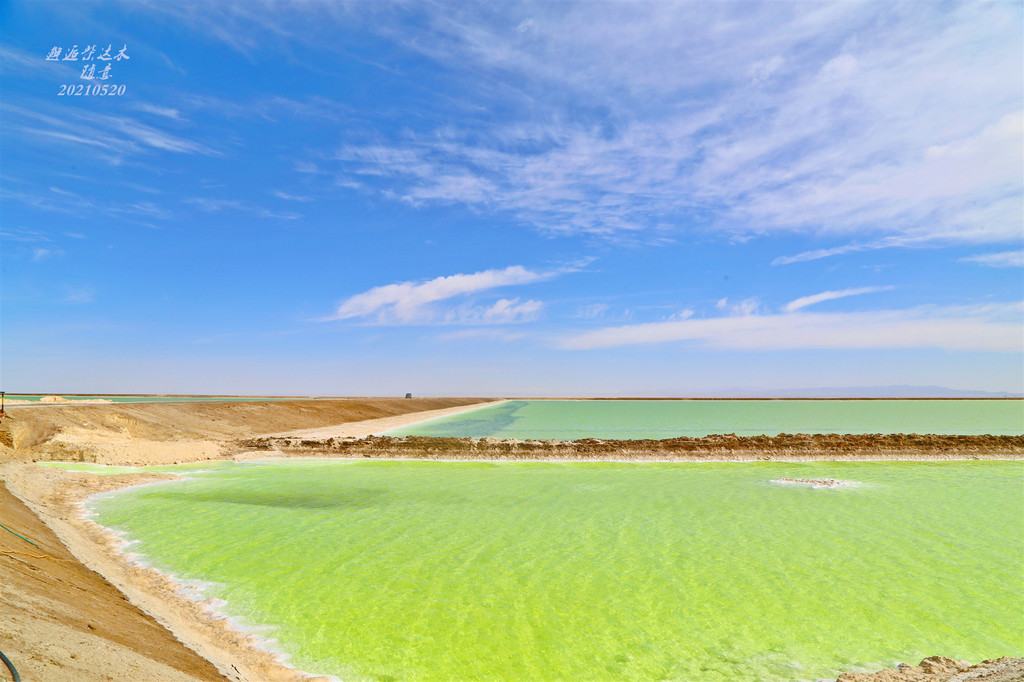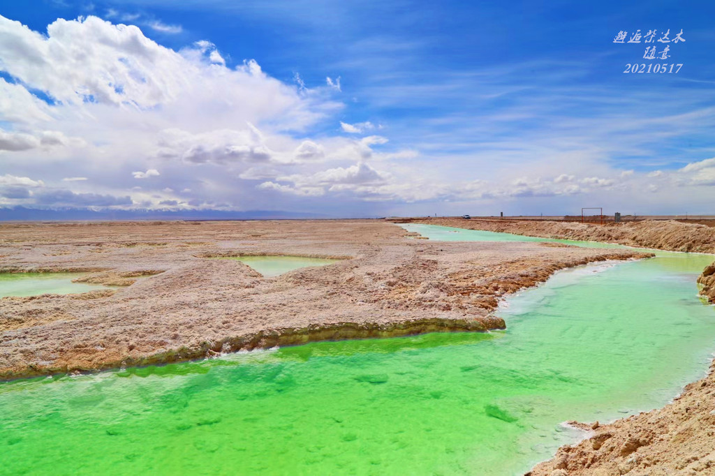 下午4点多来到茫崖翡翠湖这里比大柴旦翡翠湖更大,颜色更鲜艳,关键车子可以开进去沿路游玩,还不用门票,只收10元的车费。湖的颜色也是各式各样的,有翡翠绿、薄荷蓝、琥珀黄、牛奶白,路两边是奶白奶白的崖壁。翡翠湖是一个人工盐湖,田字状的湖水呈现出油画色彩。翡翠湖面积约26平方公里