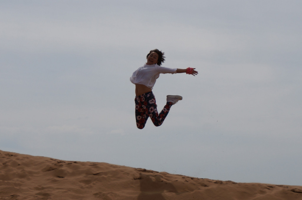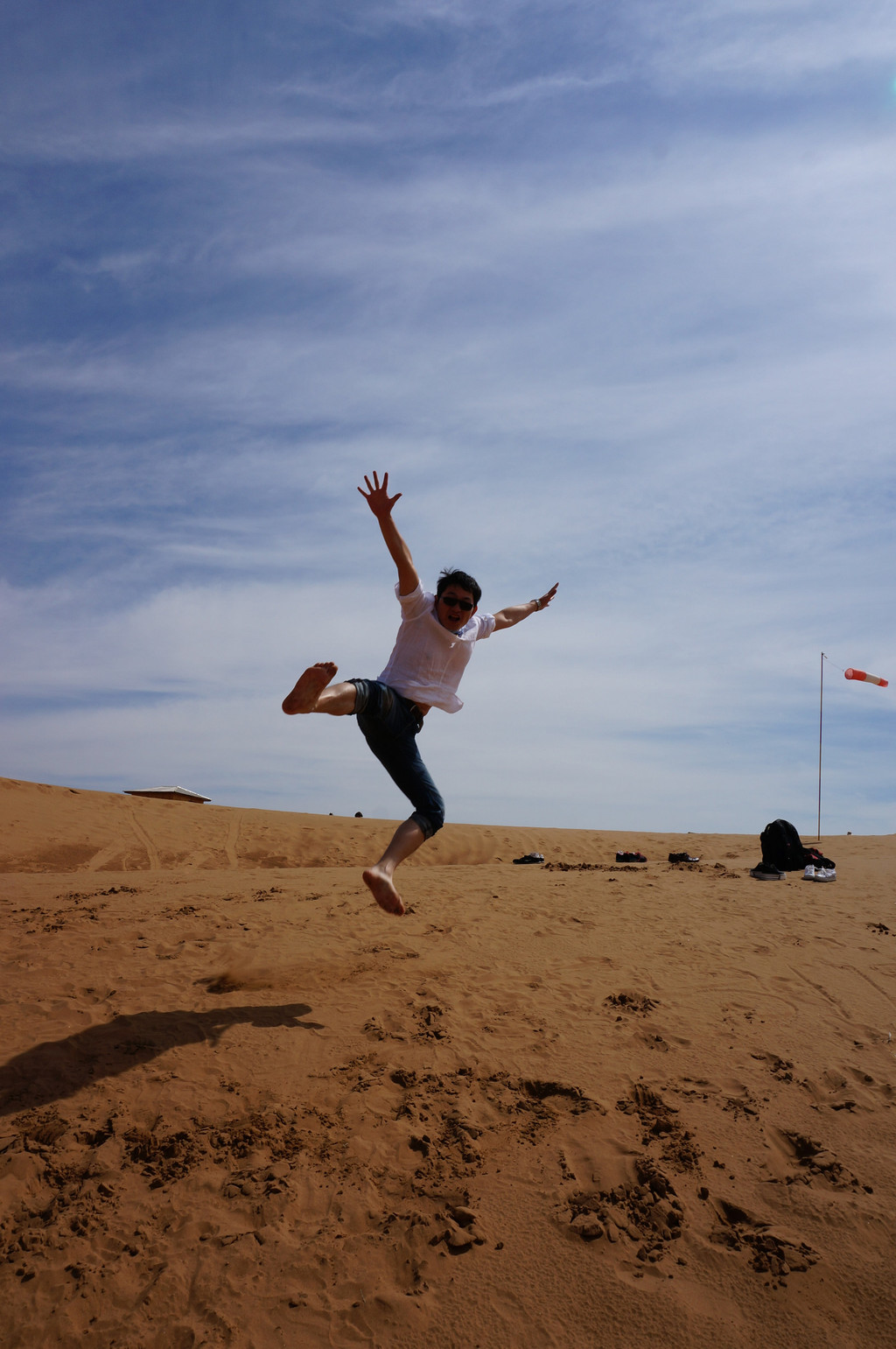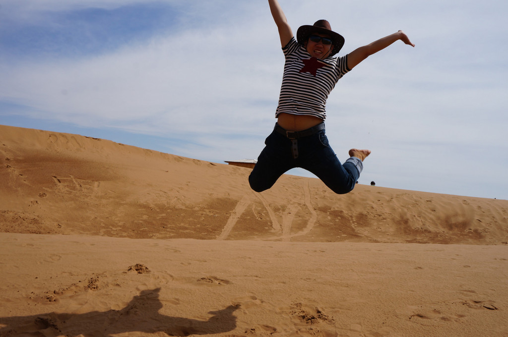 行走在沙丘的脊梁上,可以鸟瞰远方,从几十米高的沙坡上滑下来,又像云中漫步,时而停下来拍照,趁机坐下来,或者干脆躺下,都是一种怡然自得的快乐。白晃晃的沙世界,让人觉得宛若隔世,置身于其中,只会让你觉得渺小(一切都渺小,包括烦恼)、卑微、无法抗拒。