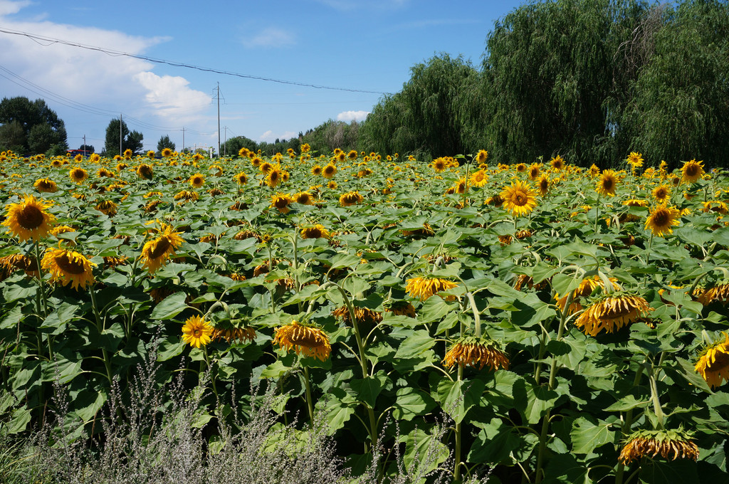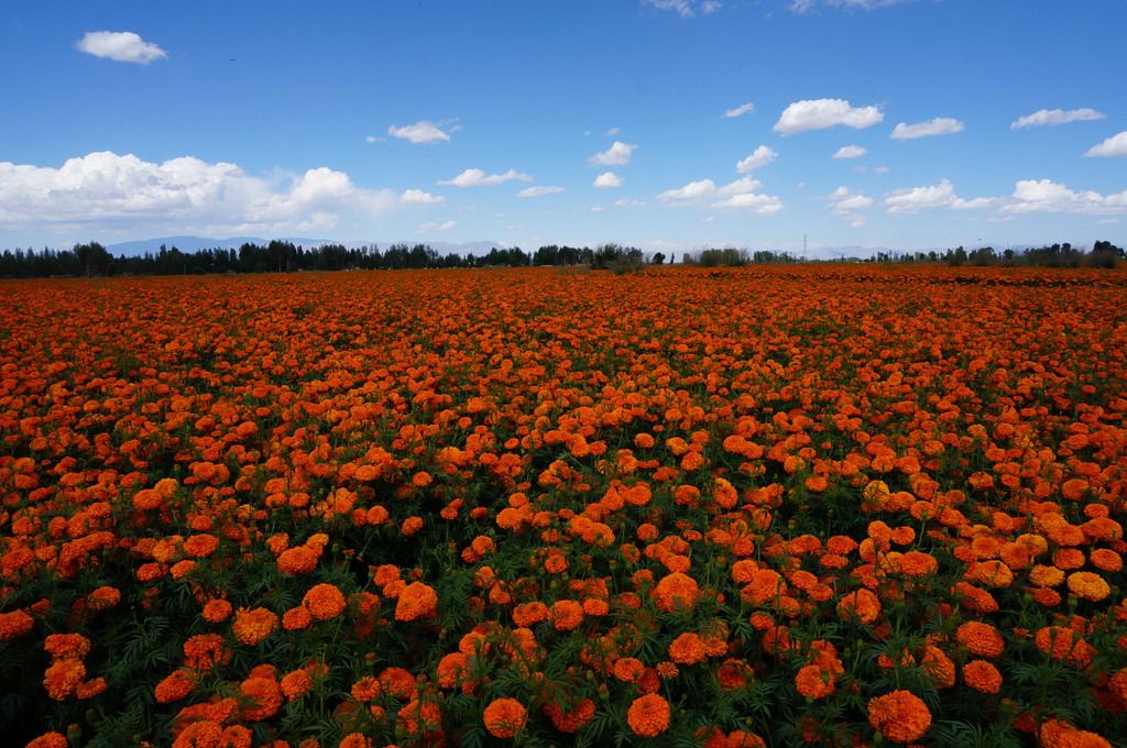 笔直的泊油路两边有郁郁葱葱的树,连绵的花海看不到尽头
