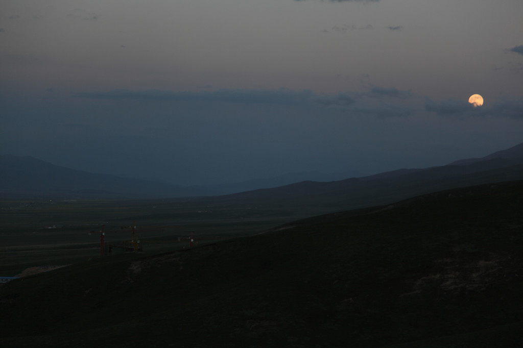 入住后,服务员热情地告诉我们在二郎剑加油站有一条直通后山的路,半山腰可以俯视整个青海湖,也可以看日落,日落时间是晚上8:40。于是果断驱车前往,在寒风中领略了青海湖的美、日落的绚丽,还看到了日落时分的满月当空。