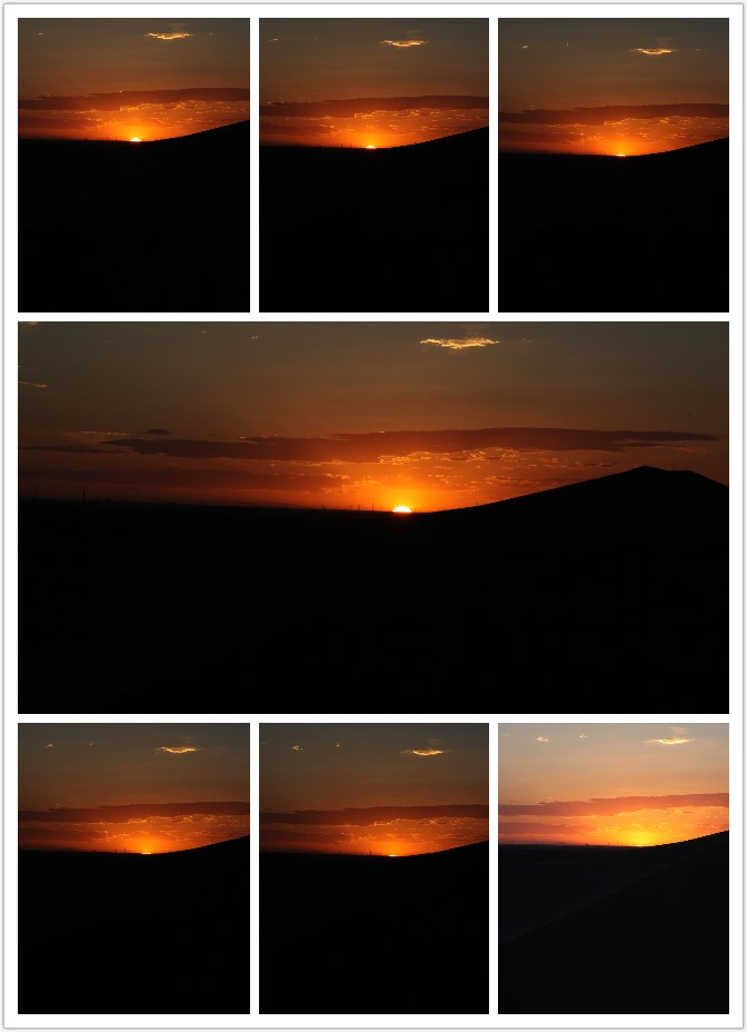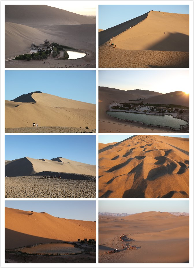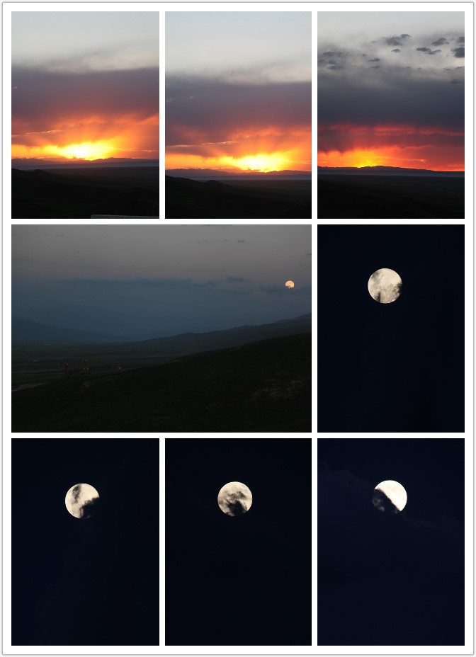 每天很晚才回到酒店,一路游玩也很累,一直没能早起看到日出,但观赏到三次绝美的日落:青海湖的落日和满月同辉(7/12, 20:40);月牙泉的落日与沙丘共舞(7/14, 21:10);雅丹魔鬼城落日和地平线的交错(7/15, 21:10)。青海湖的日落时间和敦煌的相差半个小时左右。