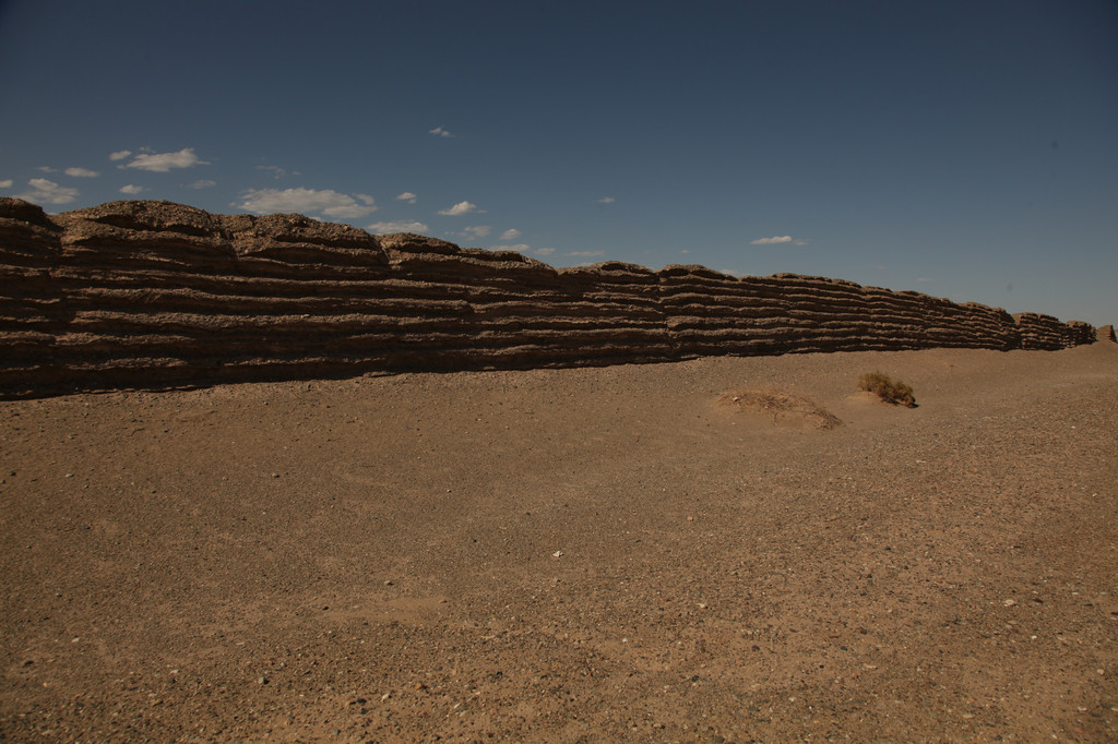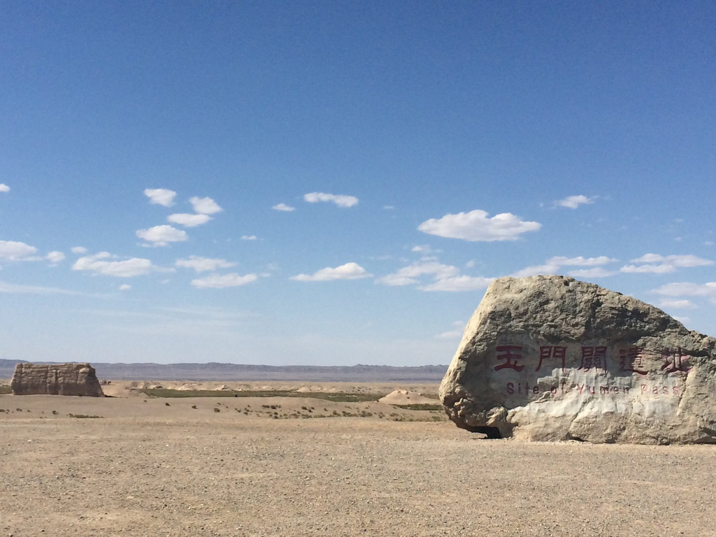 既然付了钱,咱也得去看看大名鼎鼎的玉门关?汉长城吧。看到有路标的小岔路口就进去看了一眼,留个照片。玉门关就是一块后来放的刻有“玉门关遗址”的石头和一个方形土堆,有图为证。玉门关西面党谷隧一带的长城保存较好,地基宽3米,残高3米,顶宽1米,为我国目前汉代长城保留最完整的一段。