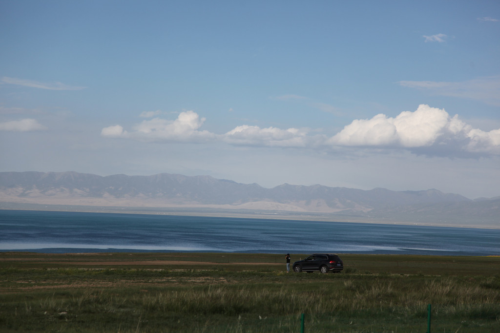 决定是英明的,从沙岛开始的沿湖东路景色确实值得推荐,尤其是对于那些只游青海湖、不去敦煌的游客。一路上既可以看到草原、青海湖,还可以感受到敦煌的沙漠。非常奇怪,青海湖东线分布着一个接一个的沙丘,连绵不断,当然每一处都有当地人看守,需要花钱才能进入骑马、骑沙地摩托、滑沙。由于已经看多了沙漠、草原,这里并没有太大的吸引力,只是走马观花。