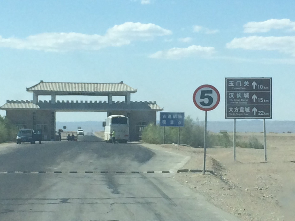 从敦煌出发沿215国道向南开大约30公里左右,在右侧可以看到“敦煌雅丹国家地质公园”的路标,右转直奔玉门关、汉长城、雅丹魔鬼城方向。网上很多人说去雅丹的路况不好,碎石路,需要开3小时,其实现在的路况非常好,一直是上好的柏油马路,虽然只是双向两车道,错车要当心,但是毕竟一路车辆非常少,常常前后几十公里没有一个车,你可以把两车道当单行道开。虽然限速80公里,由于车少,没有一个车是按限速开的,大都开到100以上,所以2个小时左右就到了雅丹,加上在玉门关、汉长城停留的时间,总时才2.5小时。