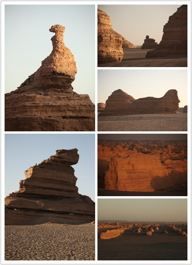 雅丹不愧号称魔鬼城,造型奇特的风蚀地貌,千姿百态,惟妙惟肖,身处其中不得不感叹大自然的耐力。太阳很晒,风沙较大,防晒霜和帽子/纱巾不可少。魔鬼城的日落也是尤其的美,一种粗犷之美,硕大的太阳从远处的地平线缓缓落下,兴奋的人群地做出各种姿势和落日合影。