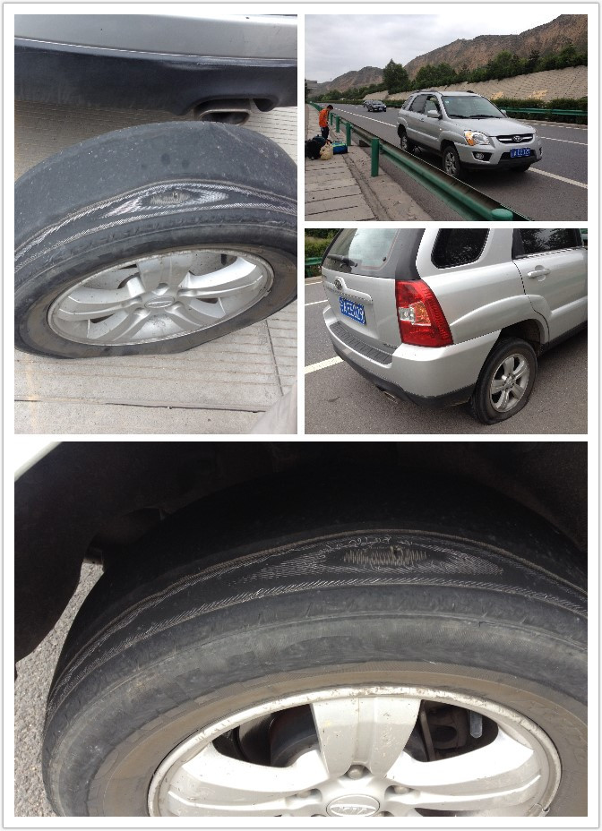惊险的一幕出现了,在回西宁的高速上,右后轮胎爆了,没有特别的感觉,只是听到的声音有异样,很像以前在北京爆胎的那次听到的类似,儿子提醒我说,可能爆胎了。于是,停靠紧急停车带,在100米外设置好警示标志,一检查,我的肺都快气炸了。