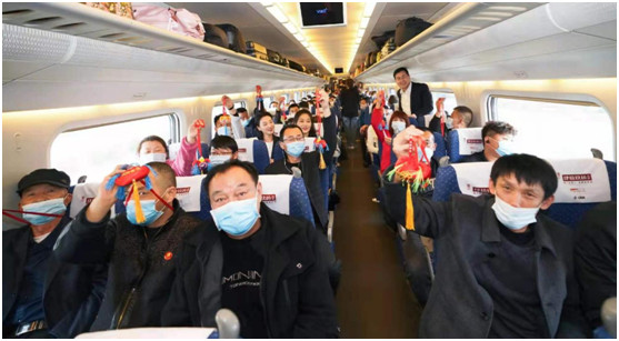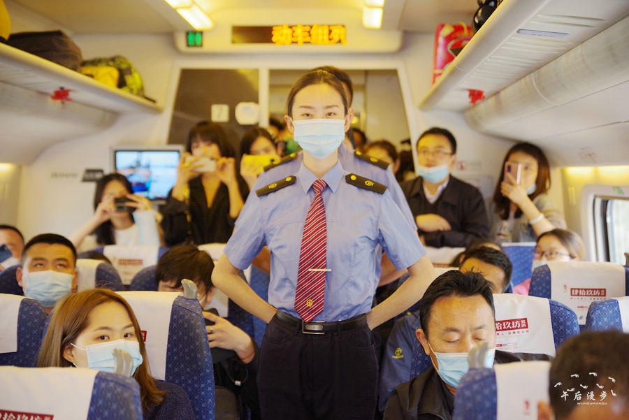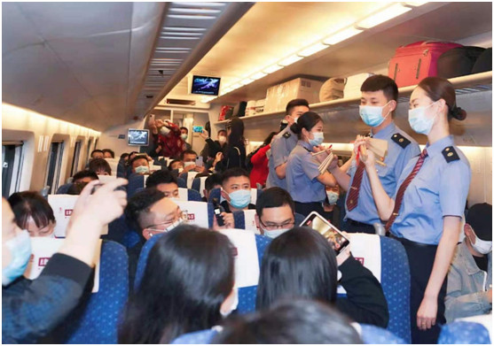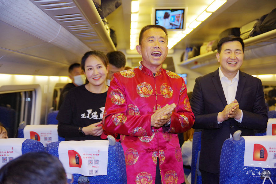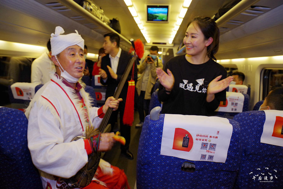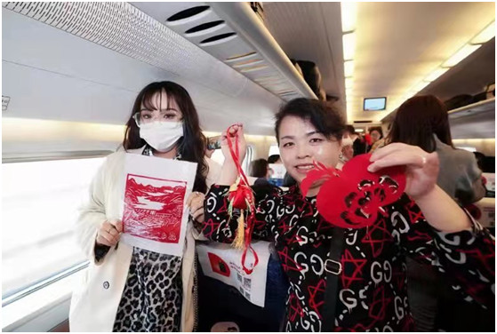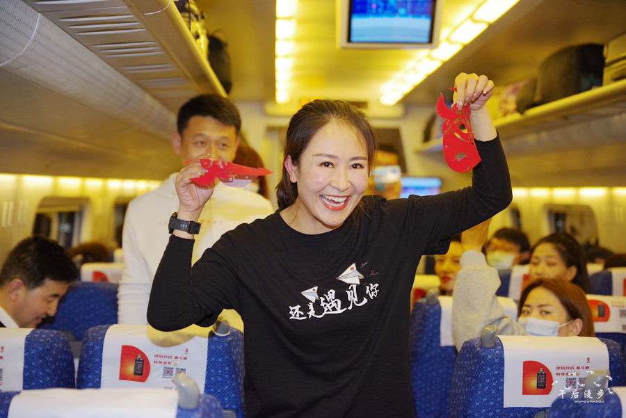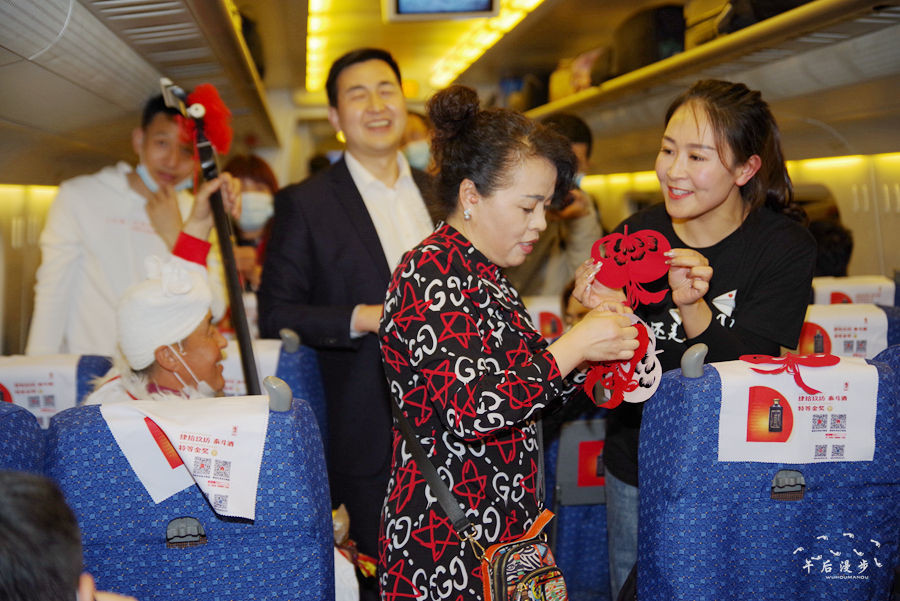 一路欢歌笑语把祝福传递,一路欣喜雀跃将美好分享。D3553次列车上,庆阳剪纸非遗传承人一举一动、剪刀一开一合间,灵巧生动的艺术之花便开满车厢;《军民大生产》《咱们的领袖毛泽东》《绣金匾》三首庆阳原产自带版权民歌,更是将乘客拉回到了那段激昂豪迈、激情燃烧的军民大生产岁月。那一个个满载老区人民祝福的香包,作为有奖问答的礼物,不断在乘客间穿梭、流动,如舞动的音符,让时间驻足,让人们永远徜徉在欢乐的海洋里,忘却烦恼、忘却忧伤,尽情把灵魂轻轻浮起。这是一趟与幸福同行的列车,这一旅程,注定被记住,被怀念,被感动。