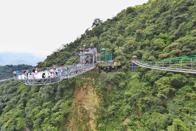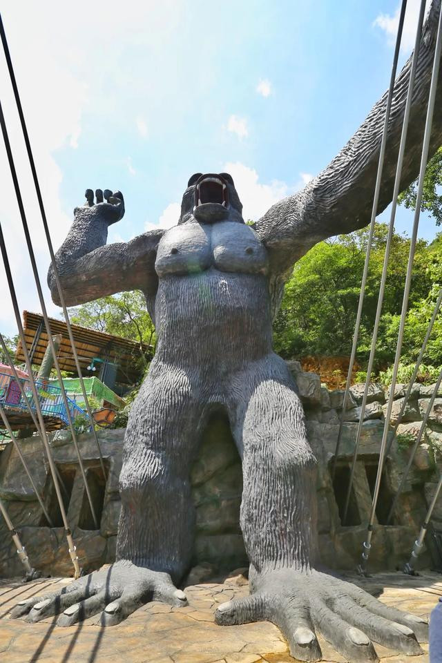 玻璃平台:全长302米,以72米的悬空跨度名列世界第一,被认证为世界最长的悬空玻璃平台。巨型UFO造型的玻璃平台位于大瀑布的顶端,高悬在绝壁之上,点睛之笔是平台顶部直径18米的巨型的玻璃观景圆台,这是和瀑布亲密接触的绝佳位置。从下往上看,感觉像是一个外星飞碟。如果说云天玻霸是钢铁巨兽,那么高达26.8米的巨型猩猩雕塑则是古龙峡的森林之魂,犀利的双眼、咆哮的神态,展示出威风凛凛的王者风范,游客们亲切的将它命名为“天王巨猩”。