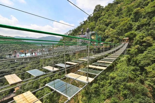步步惊心:两道并排的悬索吊桥固定在悬崖两侧,全长300米,吊桥中间每间隔1.2米就会有一个桥板,系上专业安全带后就可以跨步前行,脚下是万丈深渊,前后是峭壁凌空,每走一步都如履薄冰、惊心动魄,因此而得名。虽然惊险,但还是吸引了大量的游客、朋友们前来挑战自我,战胜自我。