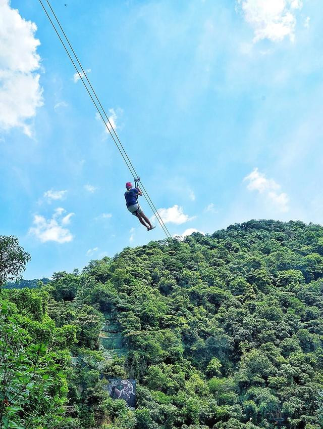 丛林飞跃 :以垂直高差263米,成功挑战了世界纪录,创造了户外空中穿越的垂直极限。该项目是由中、法、泰三国专家联合设计,使用了世界最先进最安全的连续保护系统。从瀑布顶端开始滑翔,到漂流起点垂直降落,穿越距离3.13公里,设有19个无敌观景平台,经历13段障碍挑战、飞越9条壮丽的大瀑布,5段空中滑翔,2次垂直下降。并以最后一个高35米的丛林蹦极(泰山跳)完美收官。赶紧穿好装备,迫不及待的站上滑台,勇敢的一跃而出,从万丈悬瀑飞驰而过,俯瞰整个大峡谷,尖叫声响彻山谷,一站到底的疯狂体验,刺激又好玩,这种感受真的是太爽了。