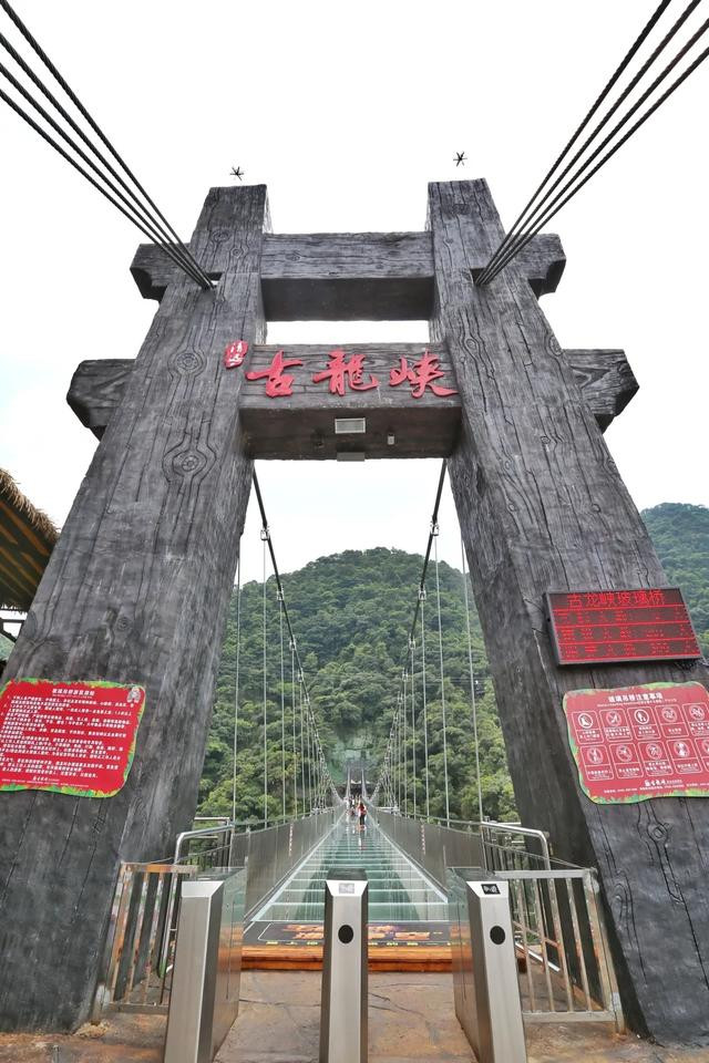 有诗云:“云崖飞流瀑千尺,峭壁撑天挂九龙“。站在玻璃吊桥远处眺望古龙瀑布,巨幅水幕,犹如仙女的白色裙摆,万绿丛中一片白。古龙瀑布上接云天玻霸,下连国际漂流,跌落峡谷荡起汹涌浪花,冲入下一个巨大深潭。