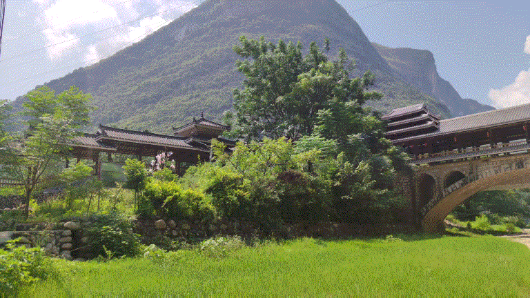 这是一座按桂北地区民间传统建筑工艺进行建造的风雨桥,包括五座桥亭和28间桥廊。桥的下半部分为钢筋水泥结构,上半部分为全杉木结构,整个建筑没有使用任何金属物附加固定,全以榫卯连接。