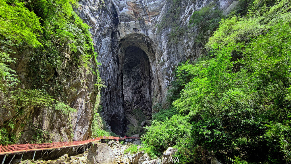 沿着原木栈道向前步行,转过一个弯巨大的燕子岩赫然出现在眼前,那种壮观和震憾的视觉冲击力是巨大的!
