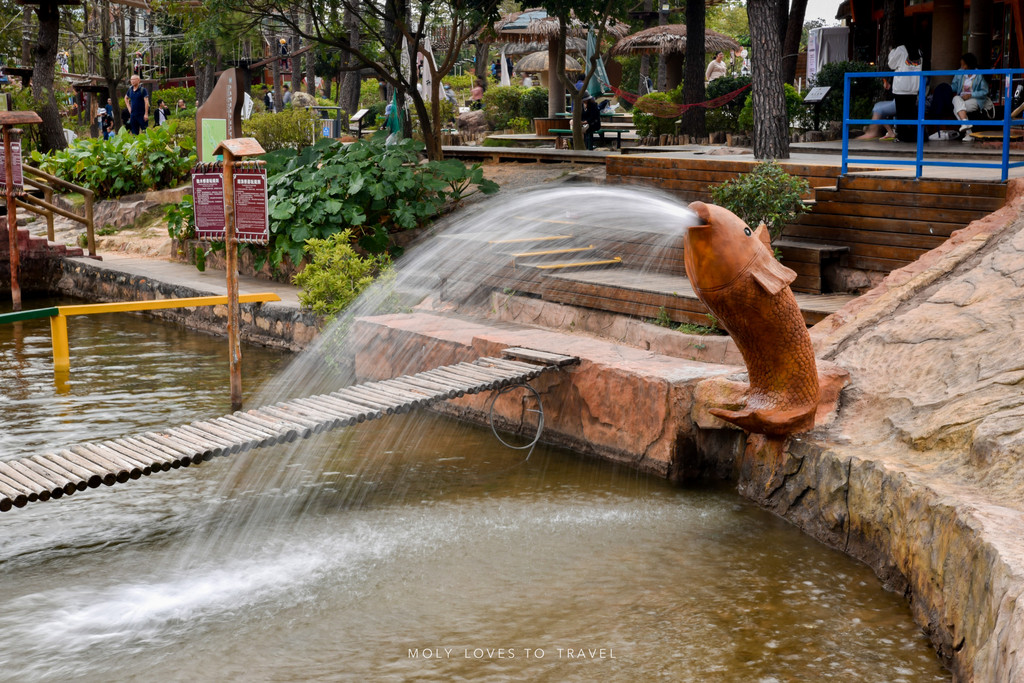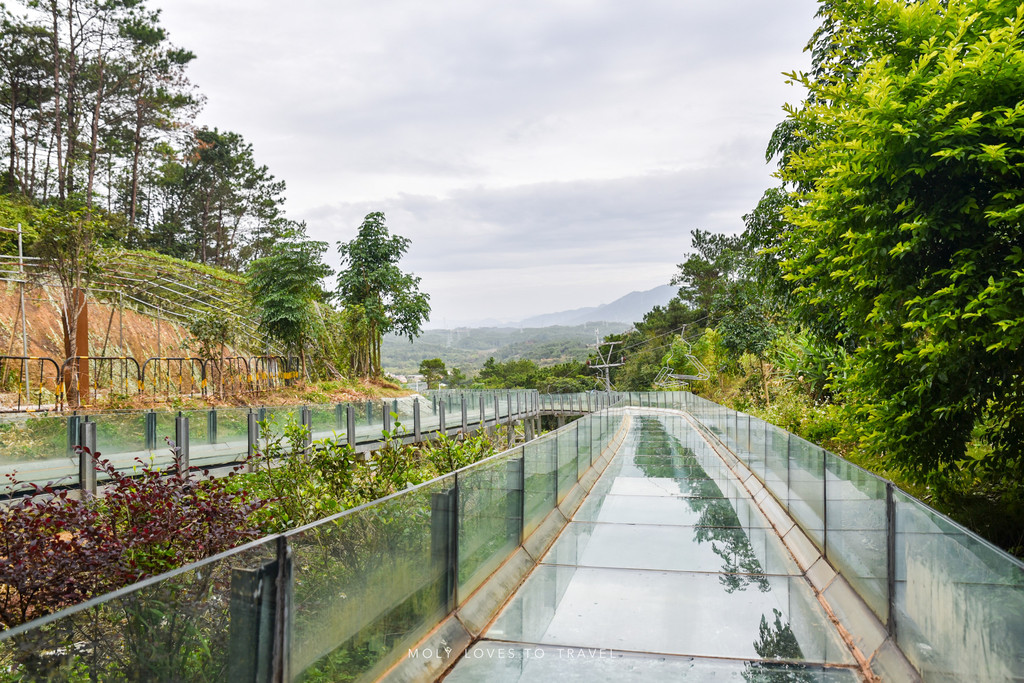 牛鱼嘴玻璃漂流,据说是世界最长的悬空玻璃漂流滑道,漂流距离长达1780米,离地最高13米360回旋漂流道,落差高达100多米,而且一年四季都可漂的空中漂流。随着漂流皮艇顺水而下,非常惊险,特别是在拐弯时更加刺激。漂流时由于速度太快水会溅到身上,夏天会非常凉爽,秋冬就建议穿好雨衣套装。