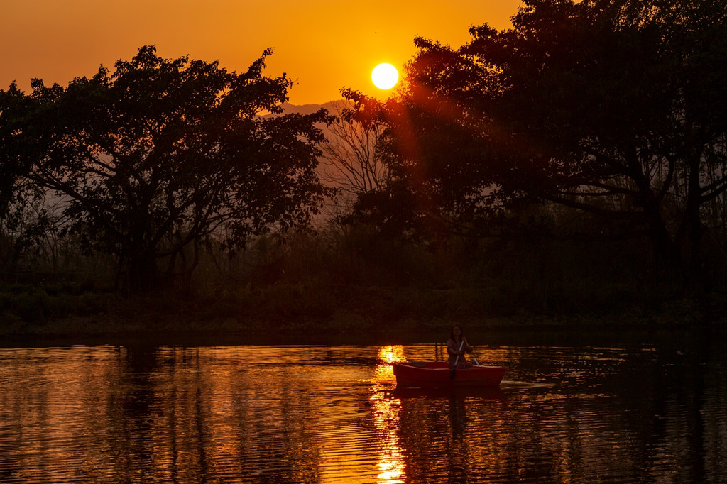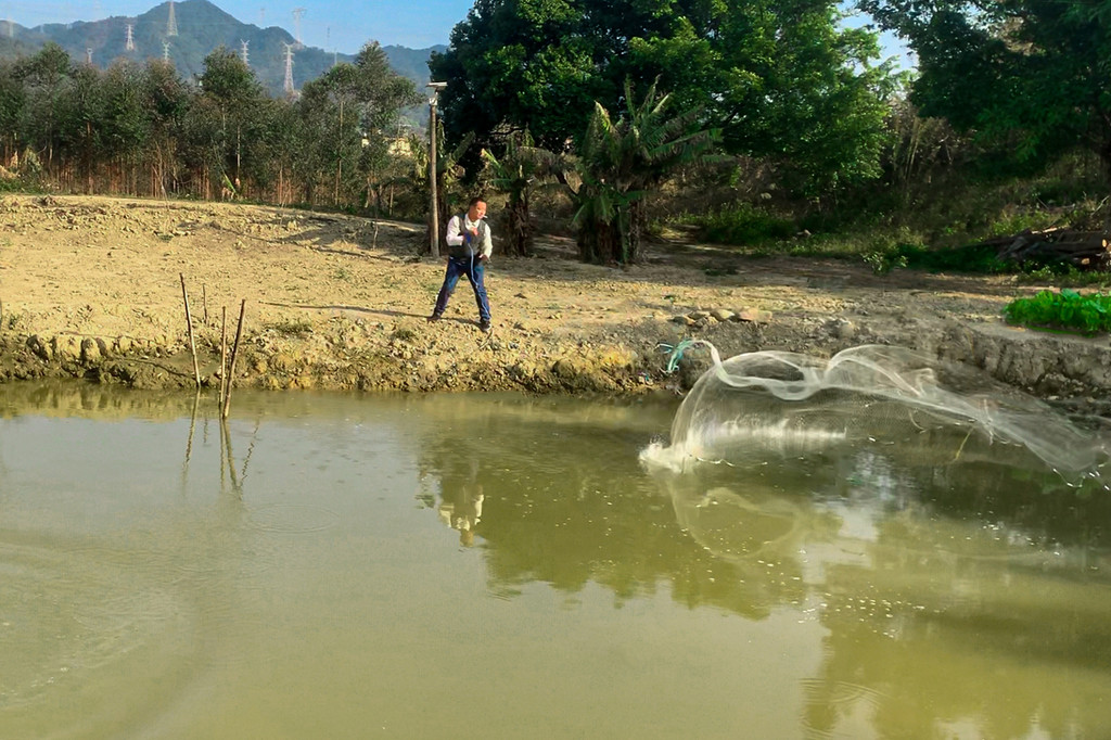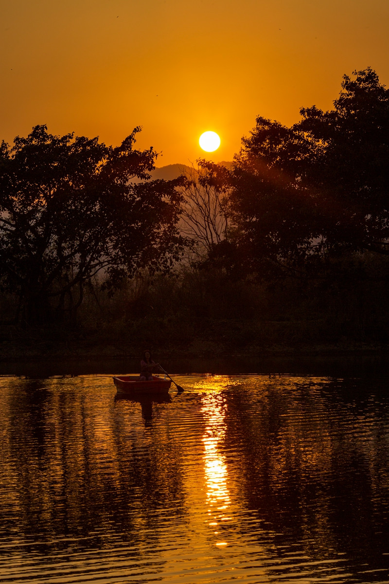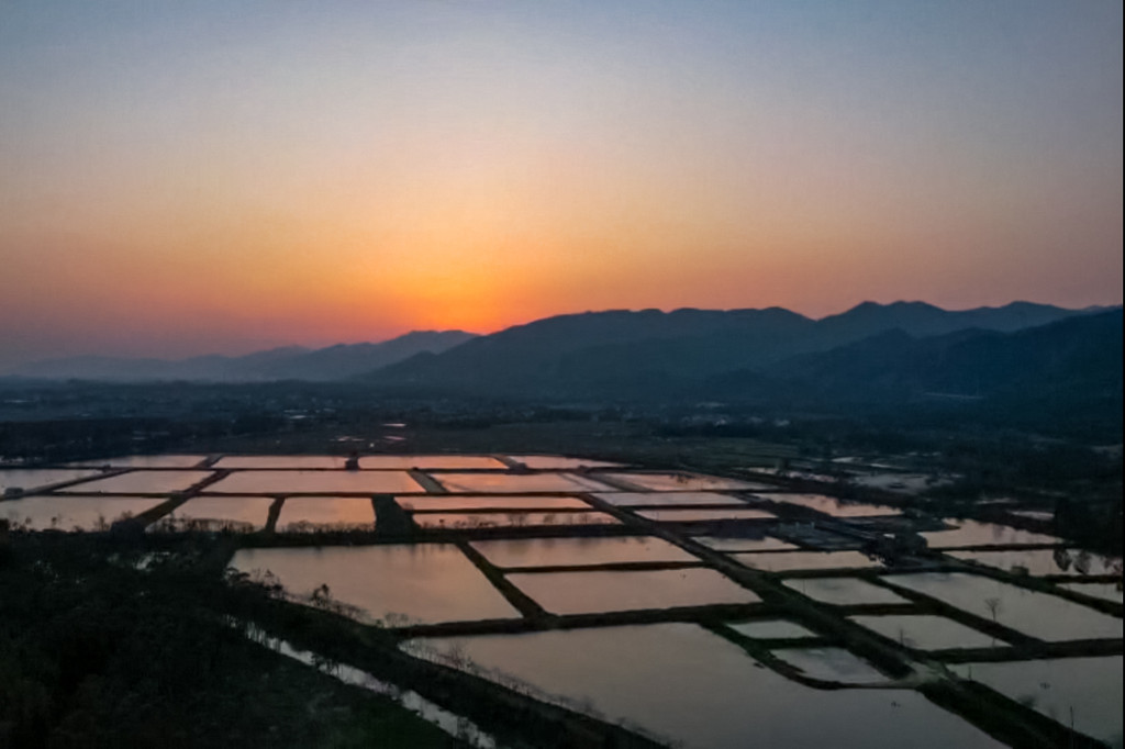 天公作美,下午五点来钟,光线变得柔和。同伴开始放无人机,居然发现村子里平畴交错,阡陌纵横,镜面似的水田镶嵌在农庄周围,如诗如画。落日余晖正好洒在池塘里,有人摇着小船,仿佛蓬莱仙槎,穿过夕阳,若隐若现。