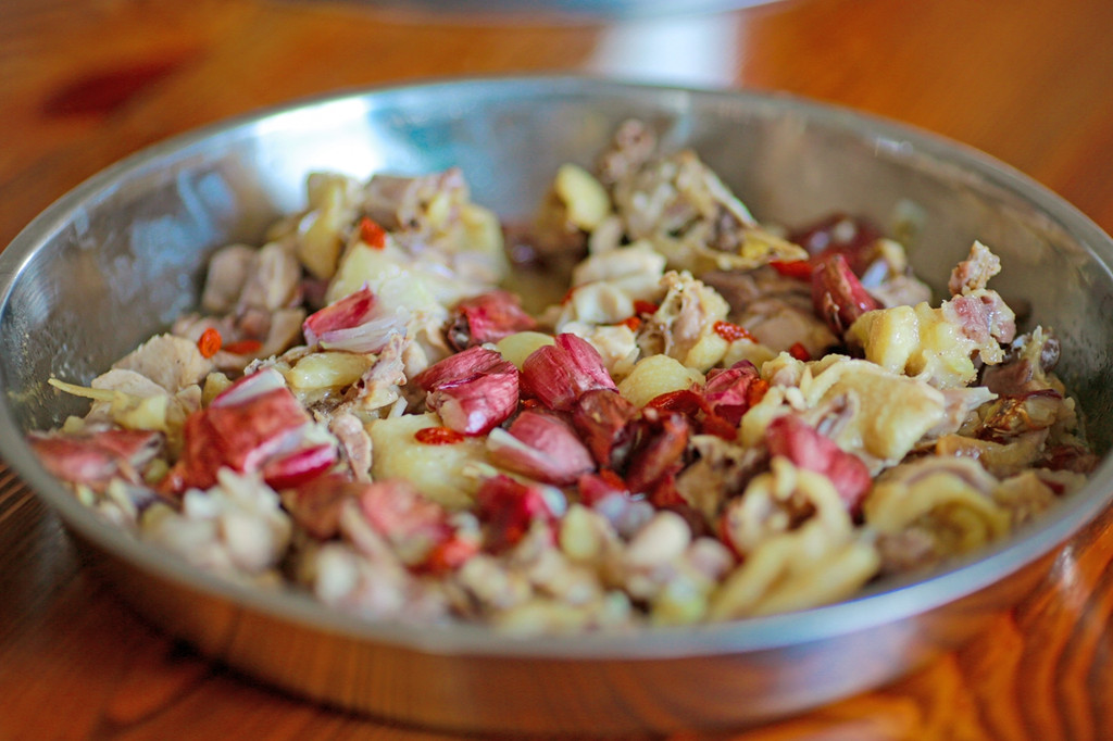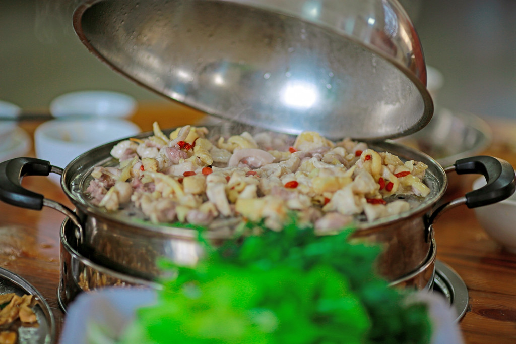 老板娘热情接待我们。看到散养的土鸡探头探脑,刚打上来的鱼儿活蹦乱跳,我们便要了沙姜鸡和清蒸鱼。果然皮爽骨香,肉鲜味美。老板娘见我们意犹未竟,怂恿道:“下午喝喝茶、划划船、拍拍照,四处逛逛,晚餐再吃桑拿鸡和红葱头蒸鸡,待天气一热,就不做桑拿鸡了”。我没吃过“桑拿鸡”,听名字觉得好奇,又见她家的鸡鸭鱼菜等食材,基本都是自给自足,便“见鸡行事”,决定在此消磨半天。