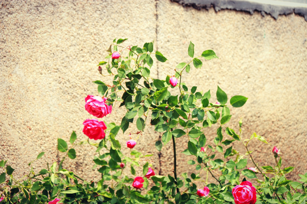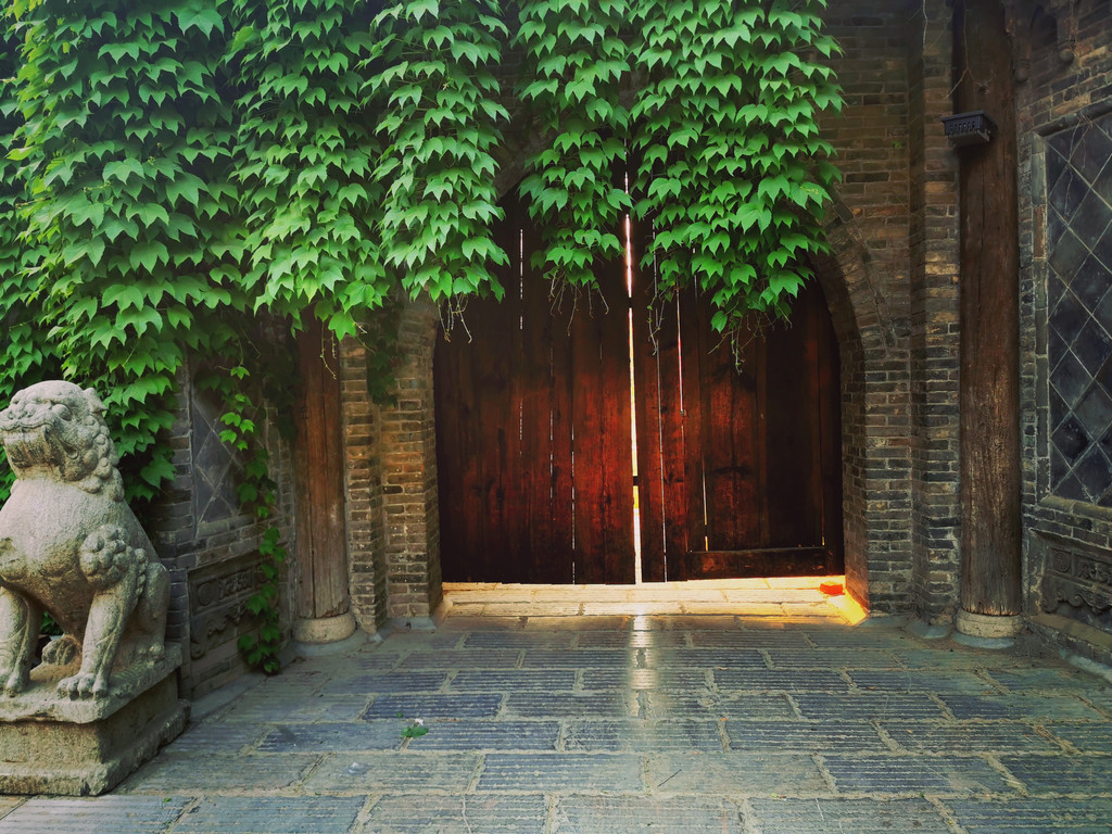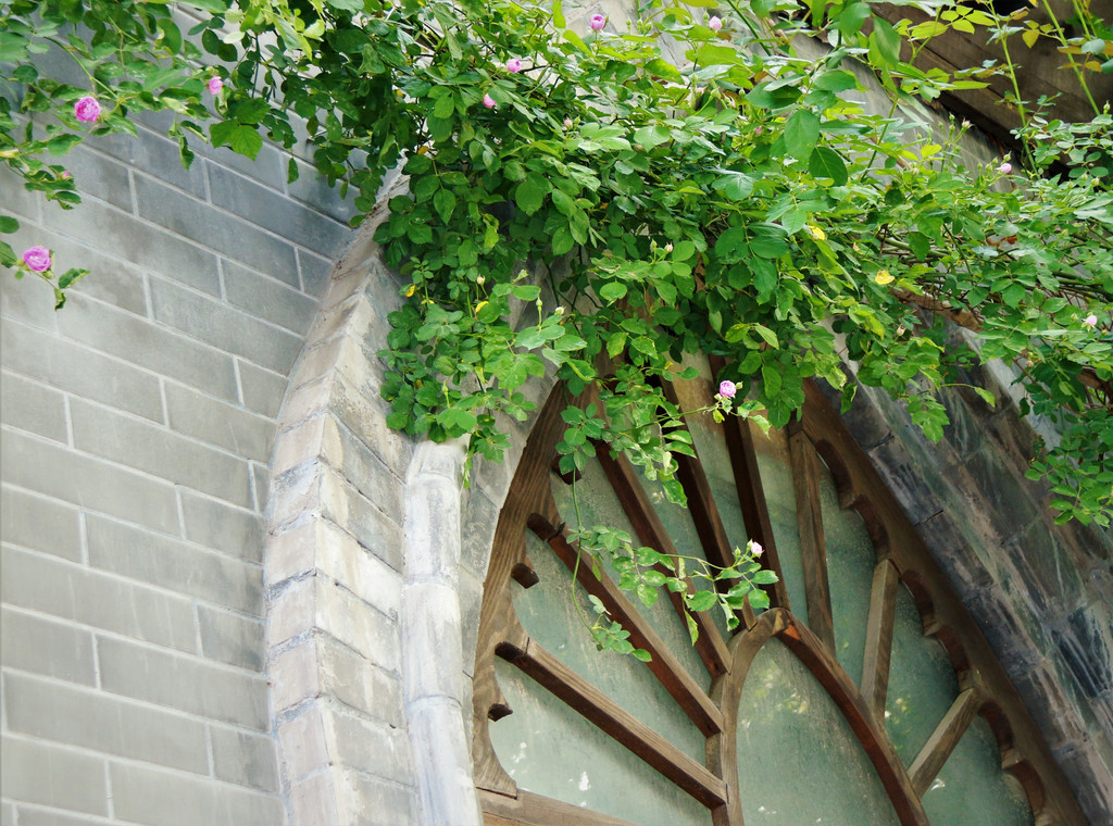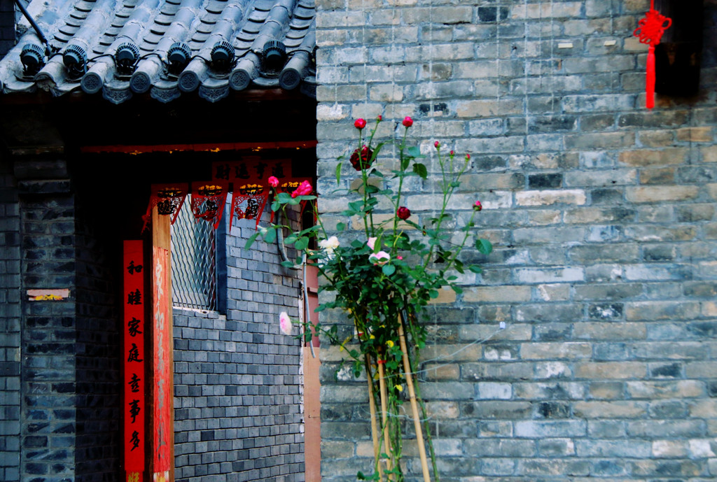 古朴建筑的家门口,盛放的花儿,搭配起来好有家的气息