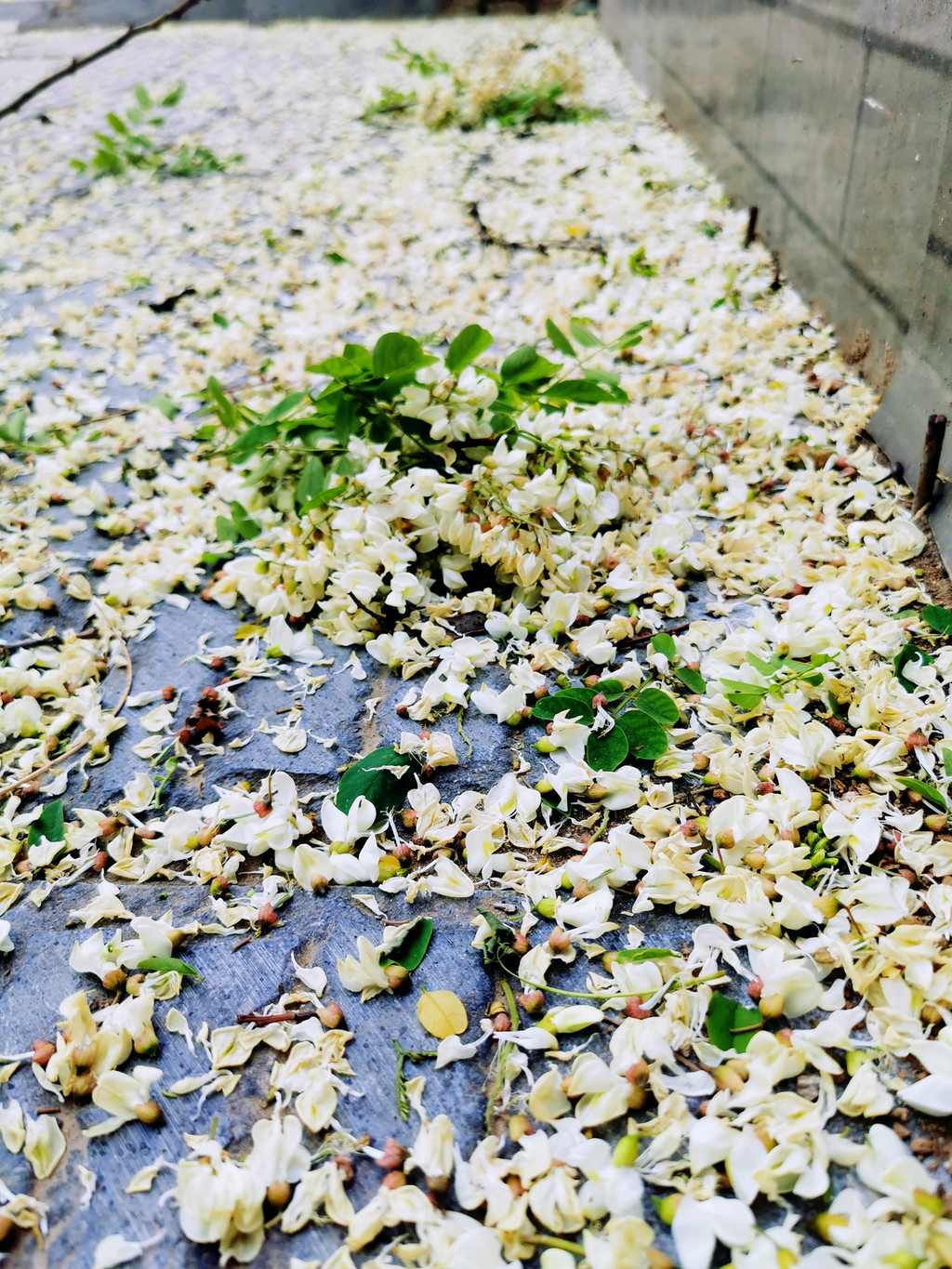 这棵树一直如飘雨般的洒落青花,密密集集,又滴滴答答,落在身上,再滚落地上,非常有趣
