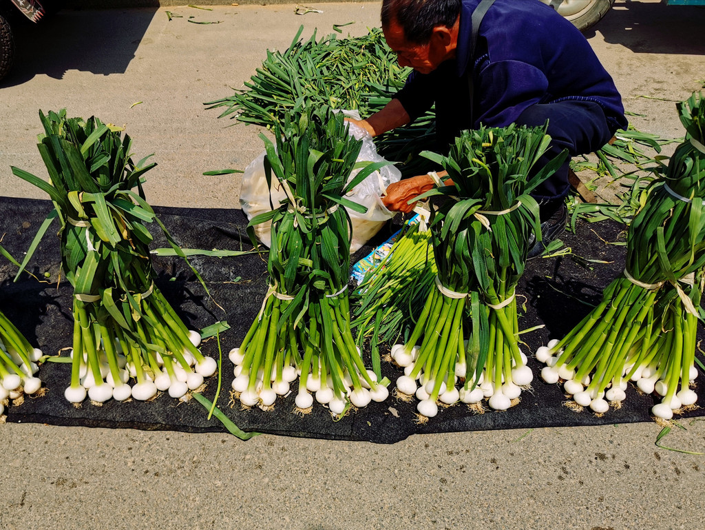 集市上摆摊卖大蒜的老人,从这些大蒜的捆绑上就可以看出老人的干净、利索的品质。
