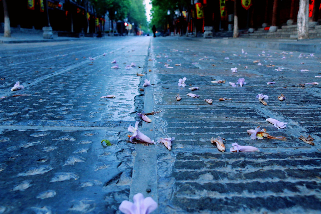 梧桐花落一地,与青条石融为一处,清新,雅致。