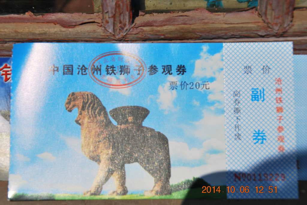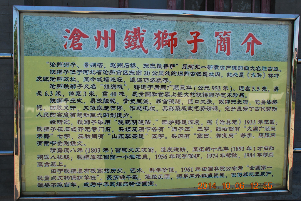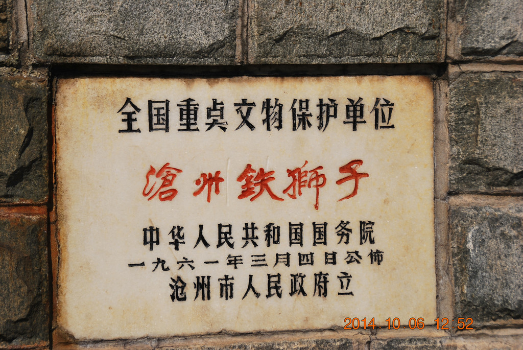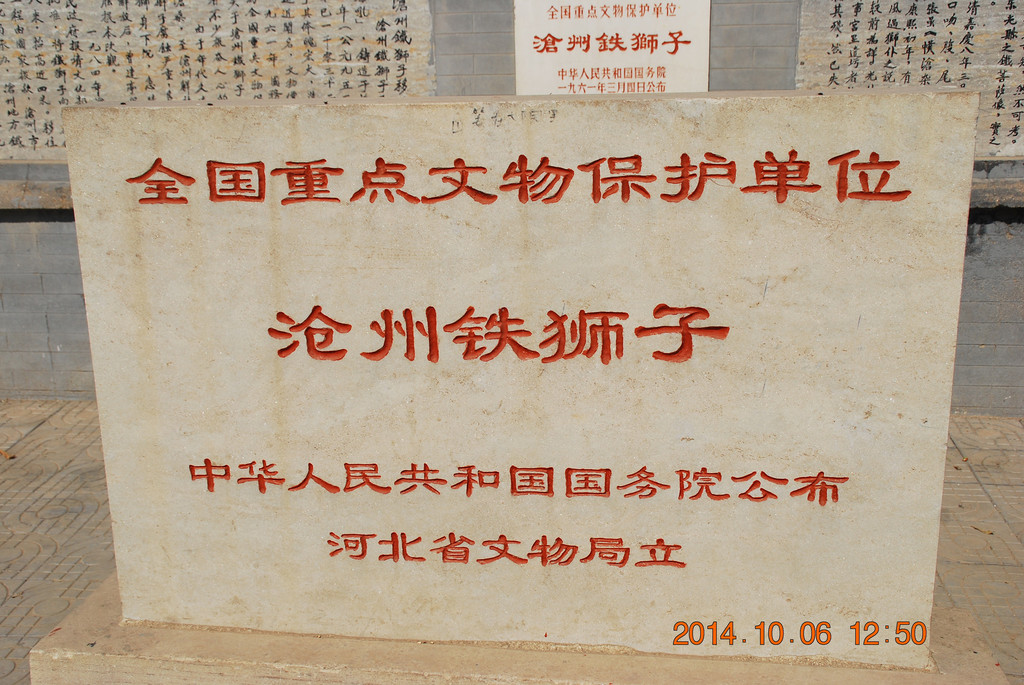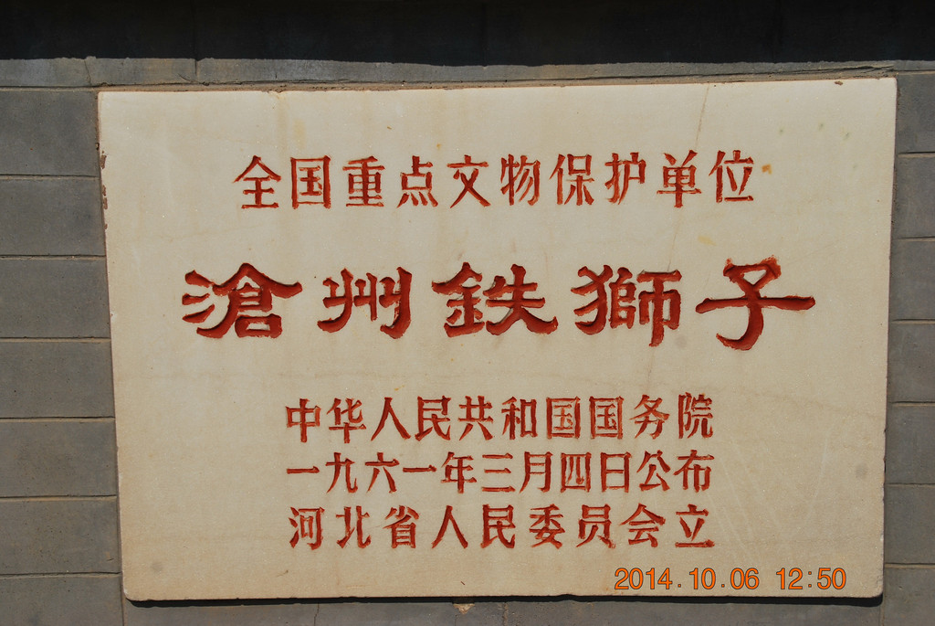 沧州铁狮子,国务院1961年3月4日公布的第一批全国重点文物保护单位,石刻及其他类,时代为后周。门票30元。
