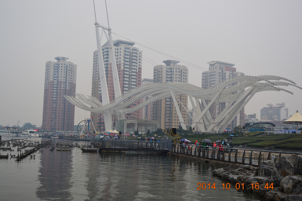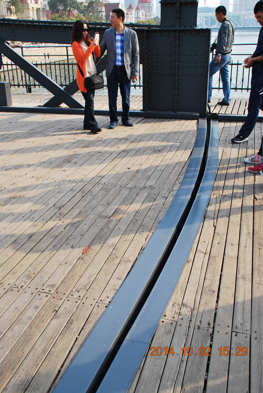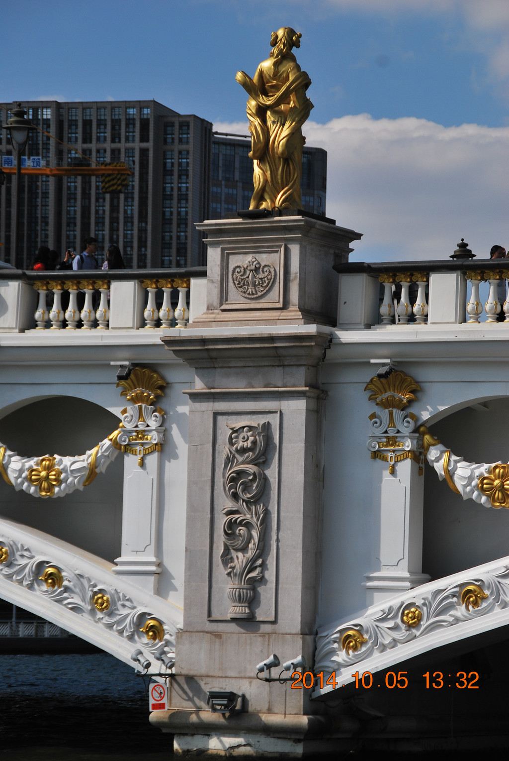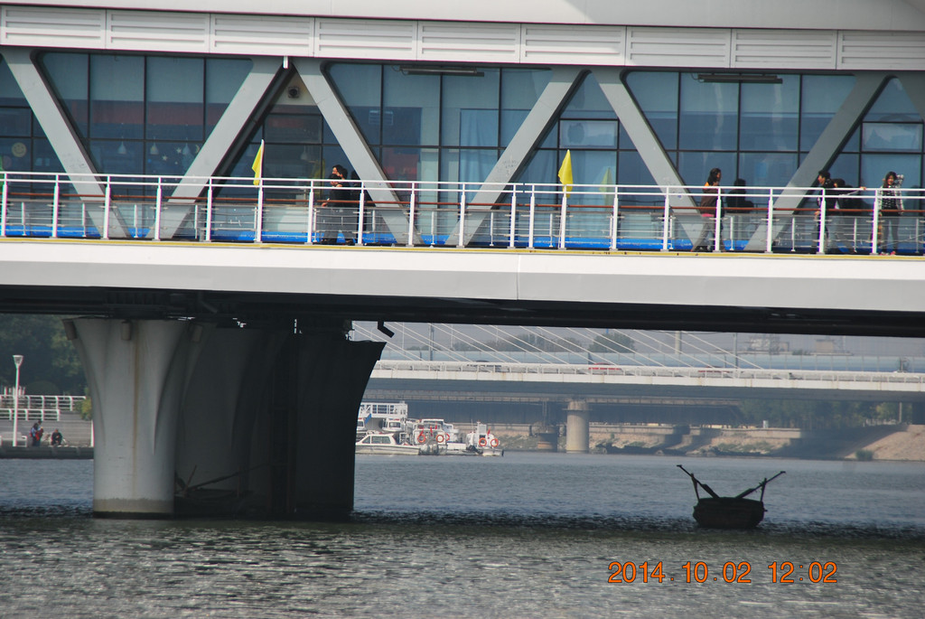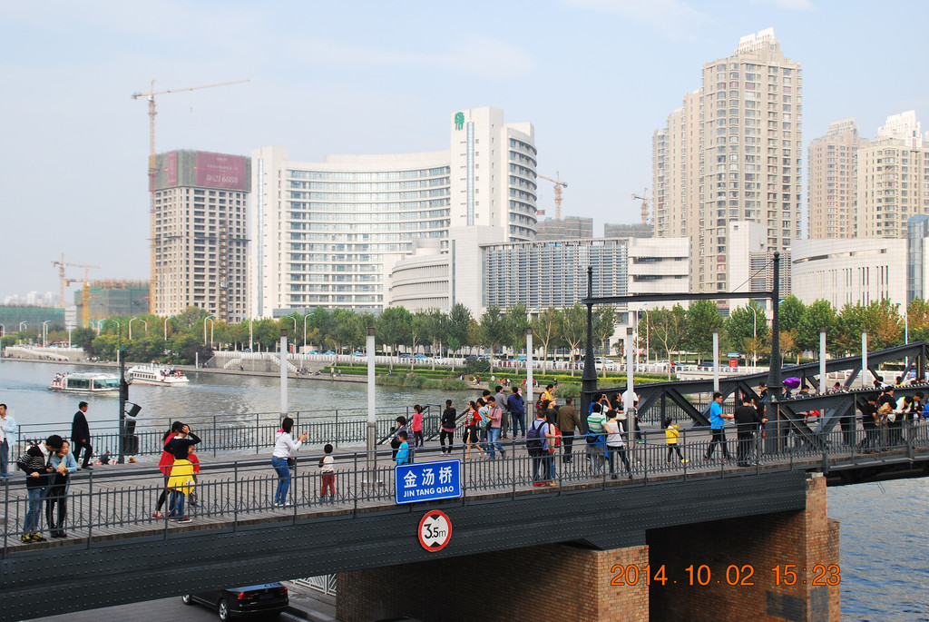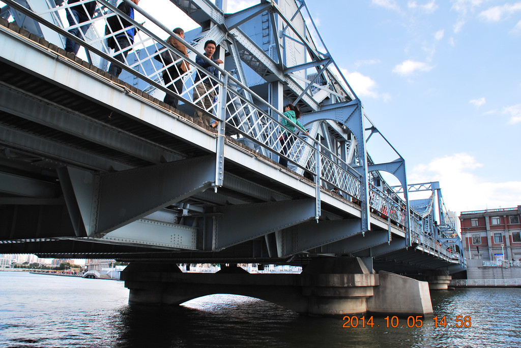 远处的桥梁为金钢桥,曾是开启式钢桥。由于年代久远损坏严重,于1996年重建新桥,新桥为双层拱桥。