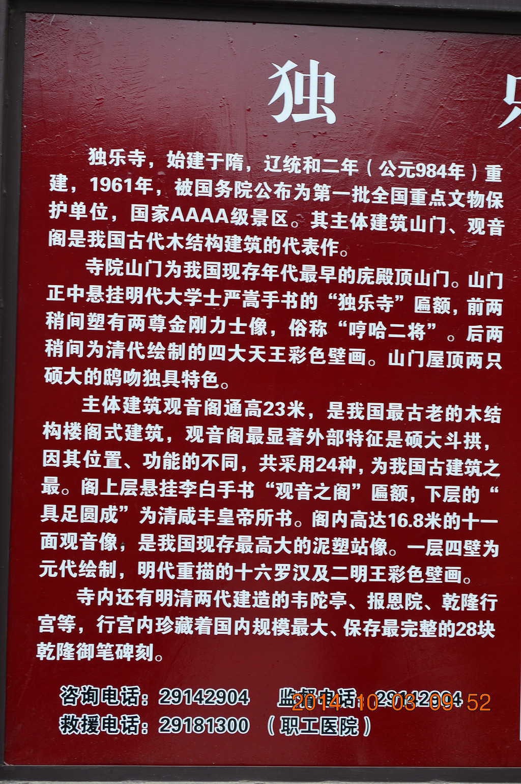 独乐寺,国务院1961年3月4日公布的第一批全国重点文物保护单位,古建筑及历史纪念建筑物类,时代为辽。独乐寺的门票含白塔寺,为40元。
