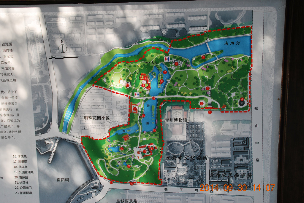 范公亭公园。北宋皇佑三年,范仲淹被贬出知青州。