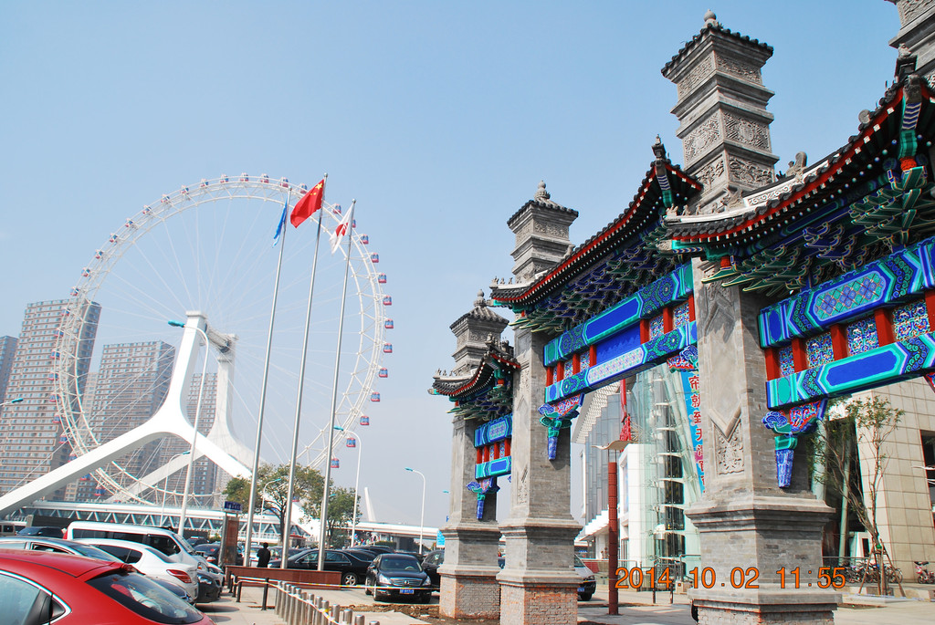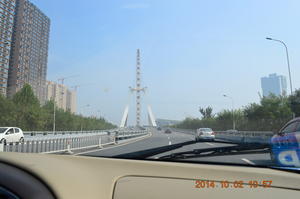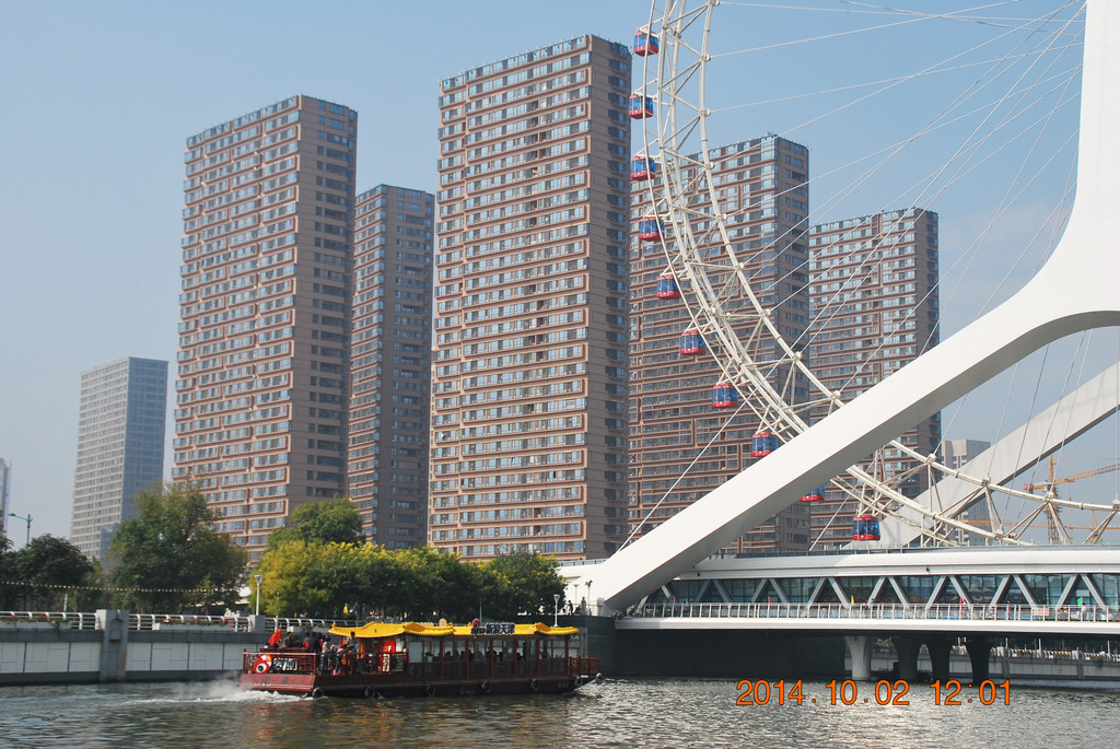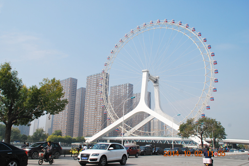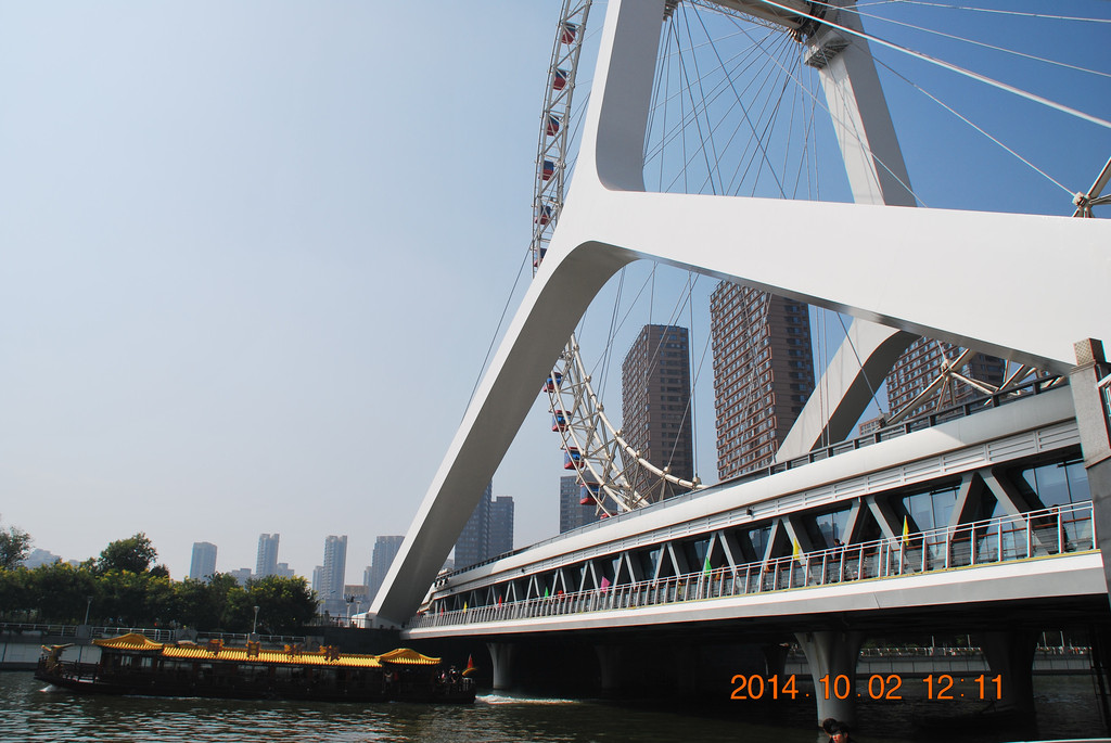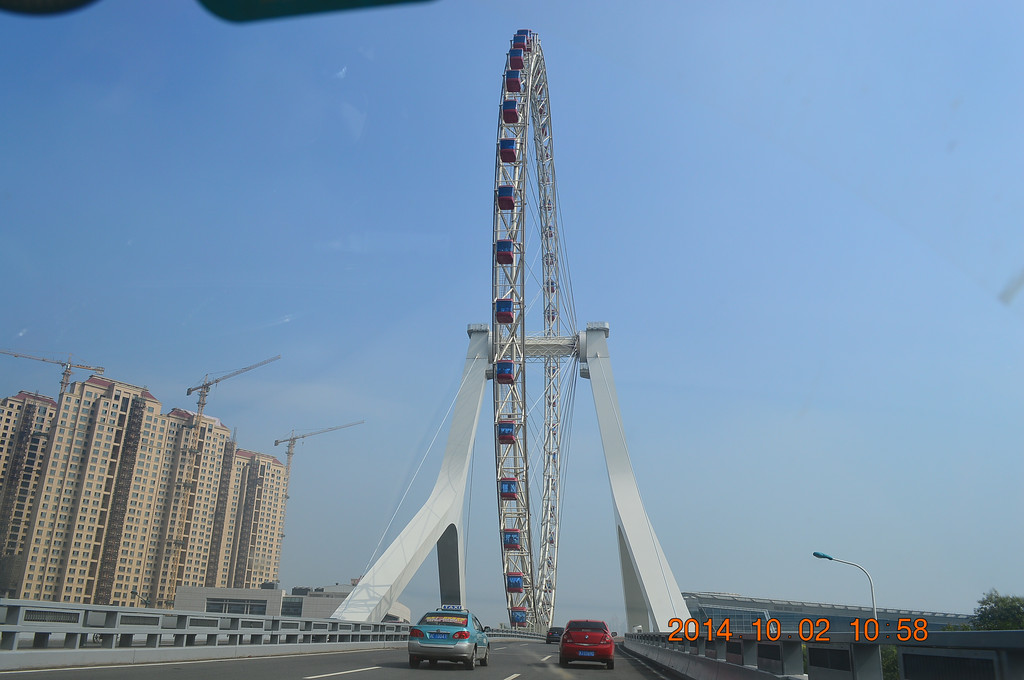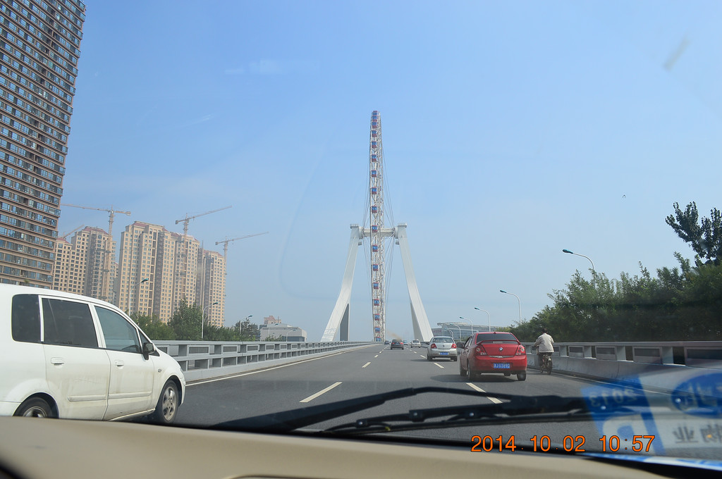 开车过永乐桥,桥上的摩天轮名为“天津之眼”。
