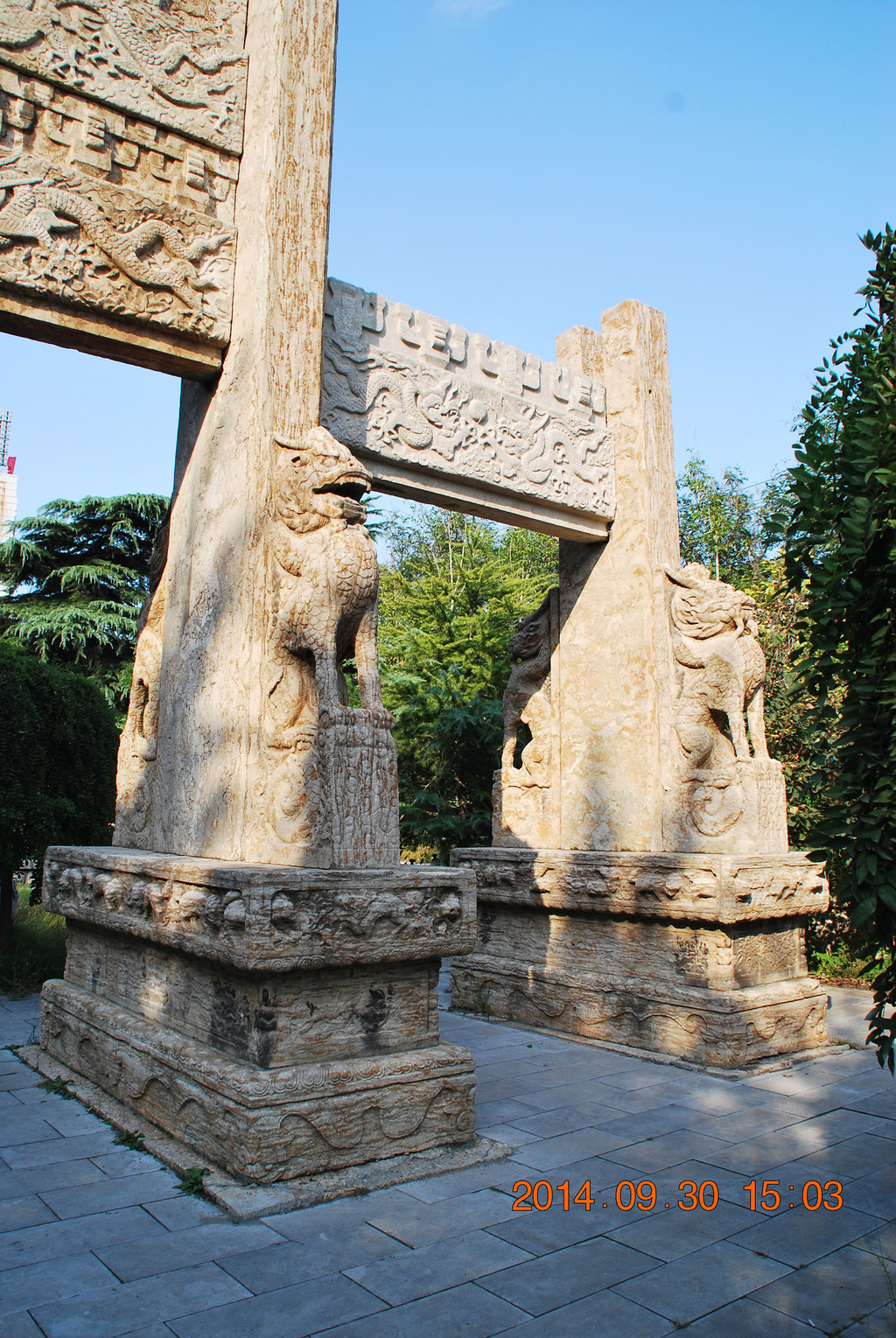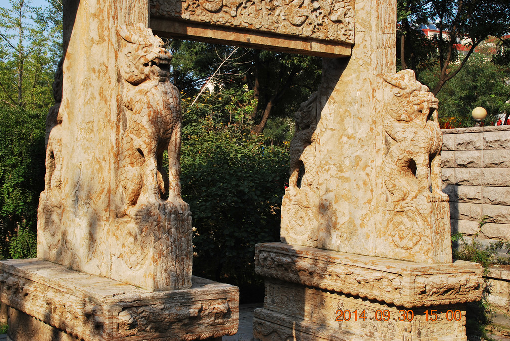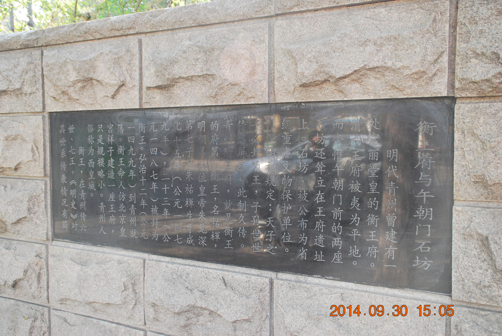 衡王府石坊在潍坊医学院分院内,与玲珑山南路一墙之隔。当我向潍坊医学院的门卫提出想进入拍照时,门卫很爽快地说“开放的青州欢迎你!”。假如没有这位门卫的热情,在围墙外无法拍摄到石坊的全景。