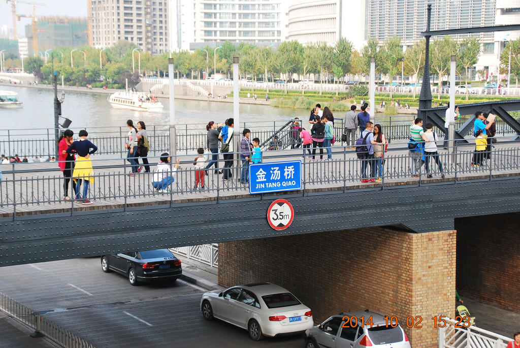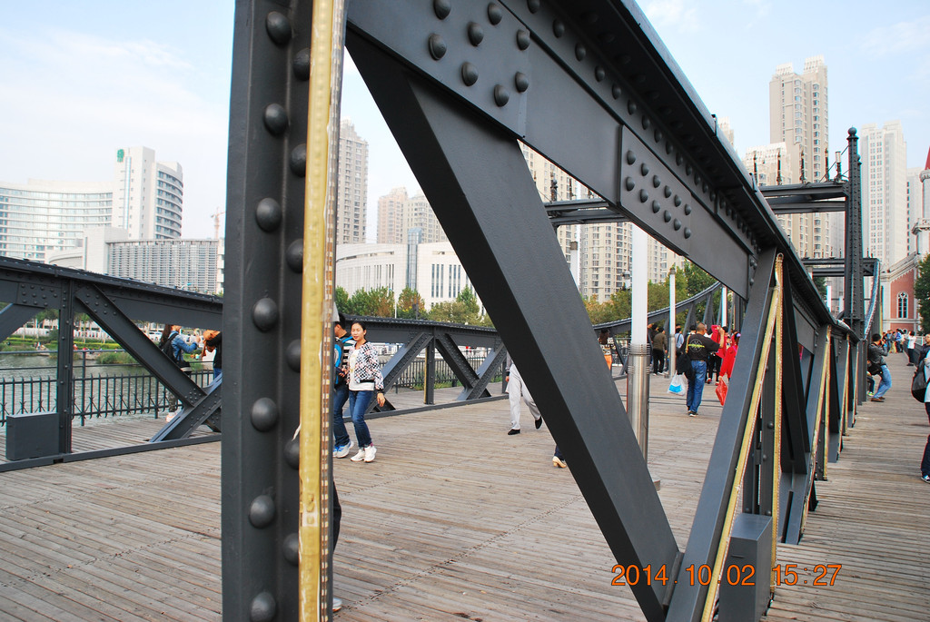 海河上的金汤桥。这是天津最早、也是目前国内仅存的三跨平转式开启的钢结构桥梁。此桥是开启桥,1970年第二次大修时开启设备被拆除,2005年再次重修时恢复了开启功能。金汤桥在解放天津的历史上有特殊位置。平津战役中,解放军集中5个军组成东西两个突击集团对天津守敌发起总攻,于1949年1月15日凌晨5时,在金汤桥上胜利会师。
