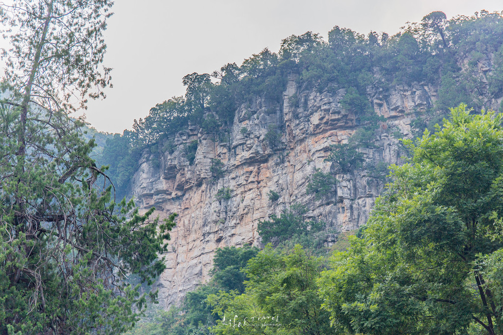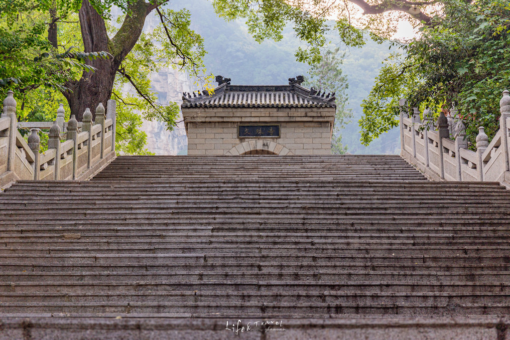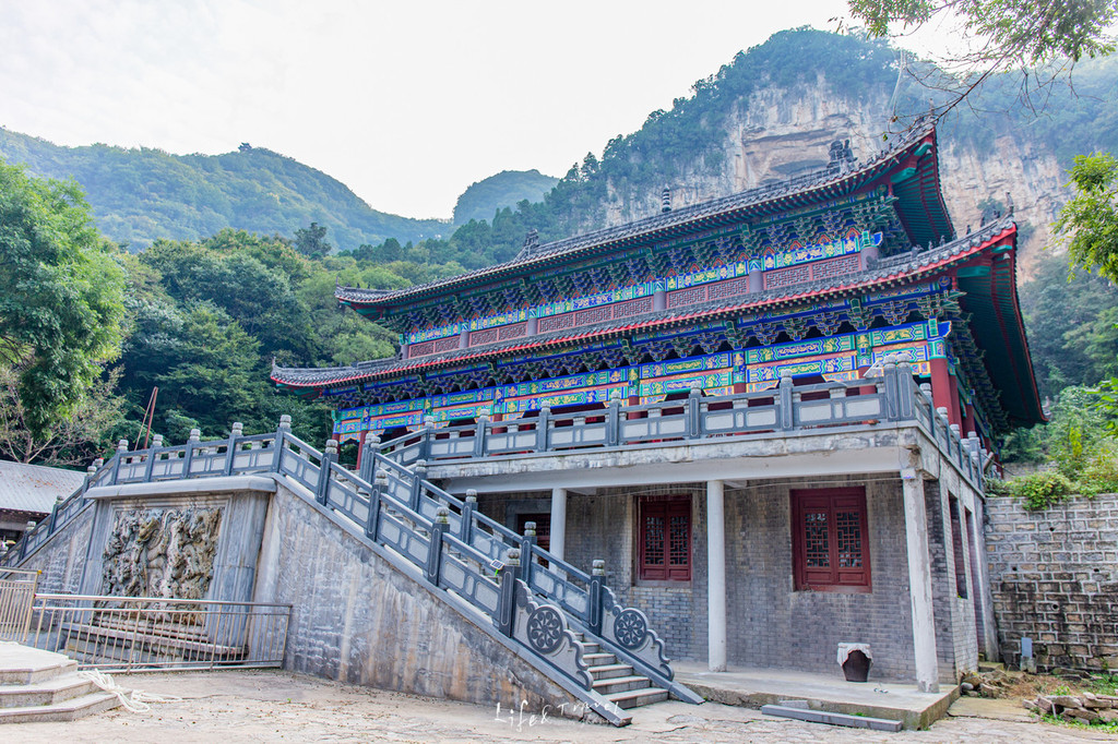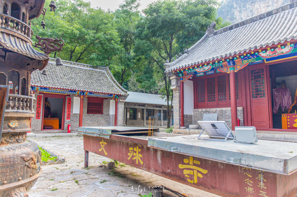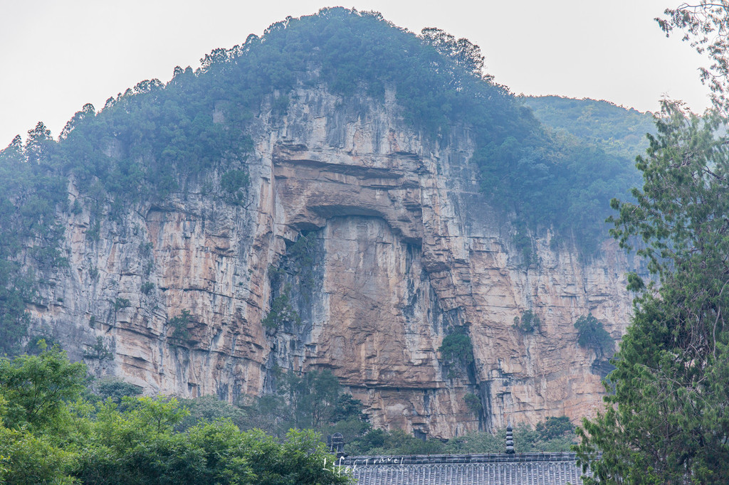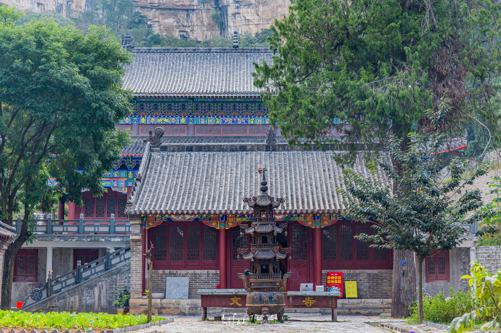 把车子停在寺外的停车场,有卖当地特产的摊子和养蜂人与游人在聊天。踩着长长的阶梯向寺内走去,脚下有几片落叶,忽觉得,到了深秋,这落叶覆满阶梯,也是别有一番味道的。文殊寺,特殊在于寺院三面被悬崖围着,崖壁上清晰可见摩崖题刻,很是壮观。