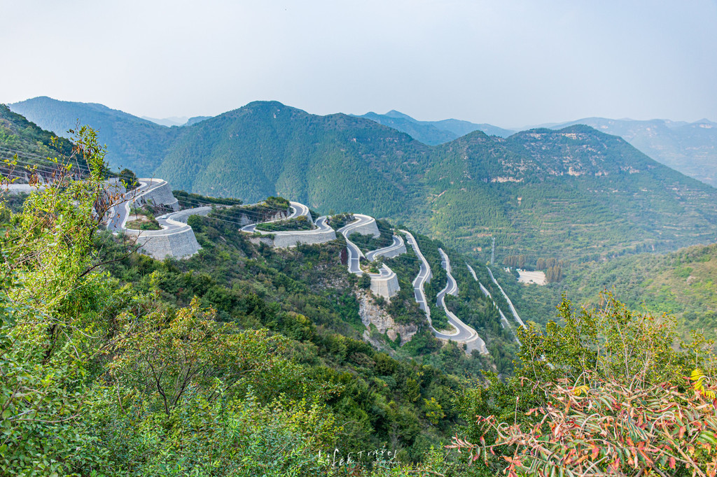 这本是一条蜿蜒的盘山公路,站在观景台处俯瞰公路,顿觉天地之间气势雄伟。