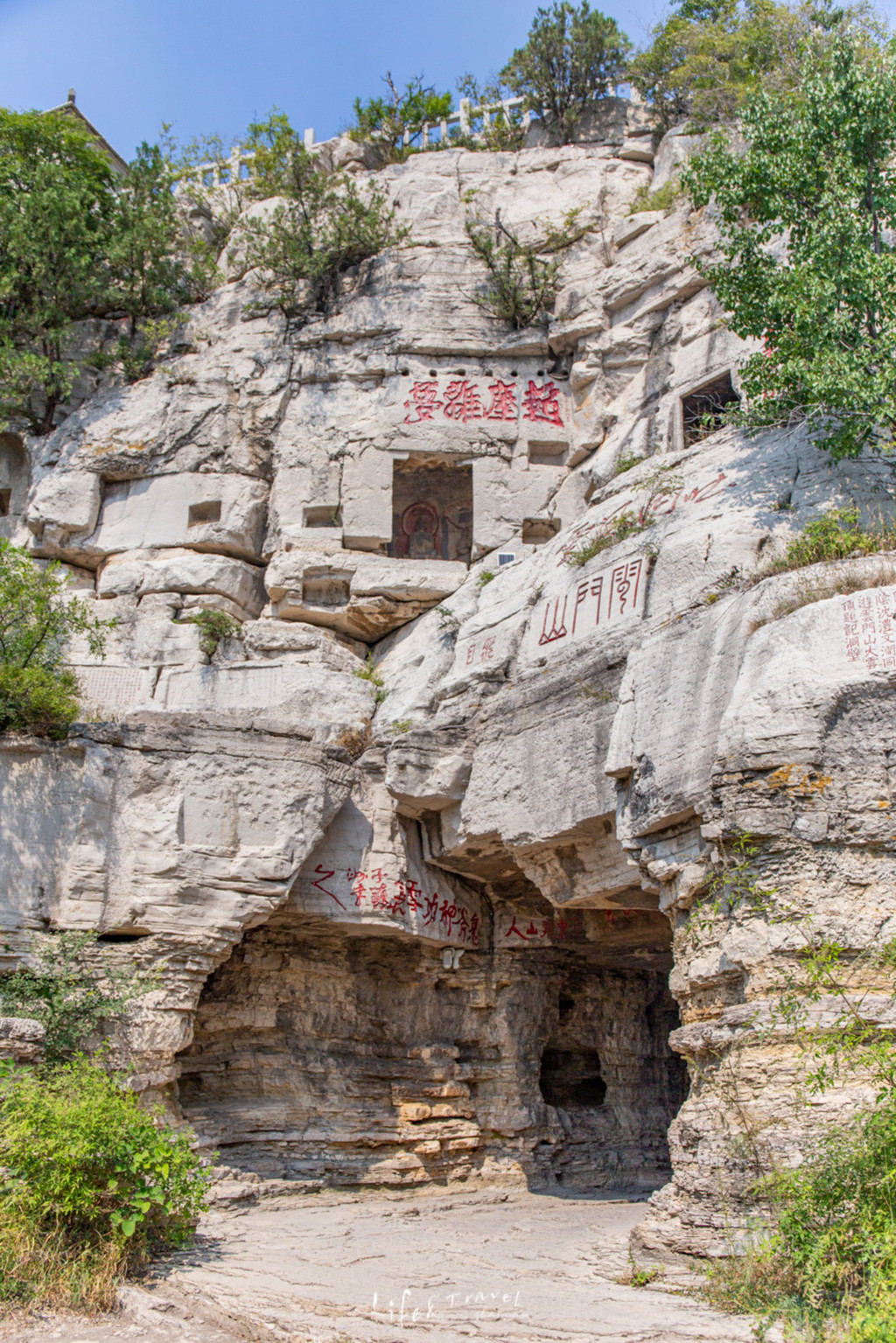 整个寺院的三面被悬崖围着,崖壁上清晰可见摩崖题刻,很是壮观。