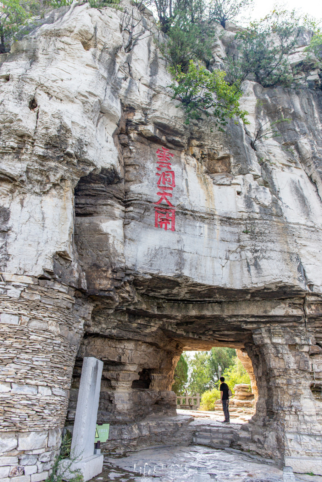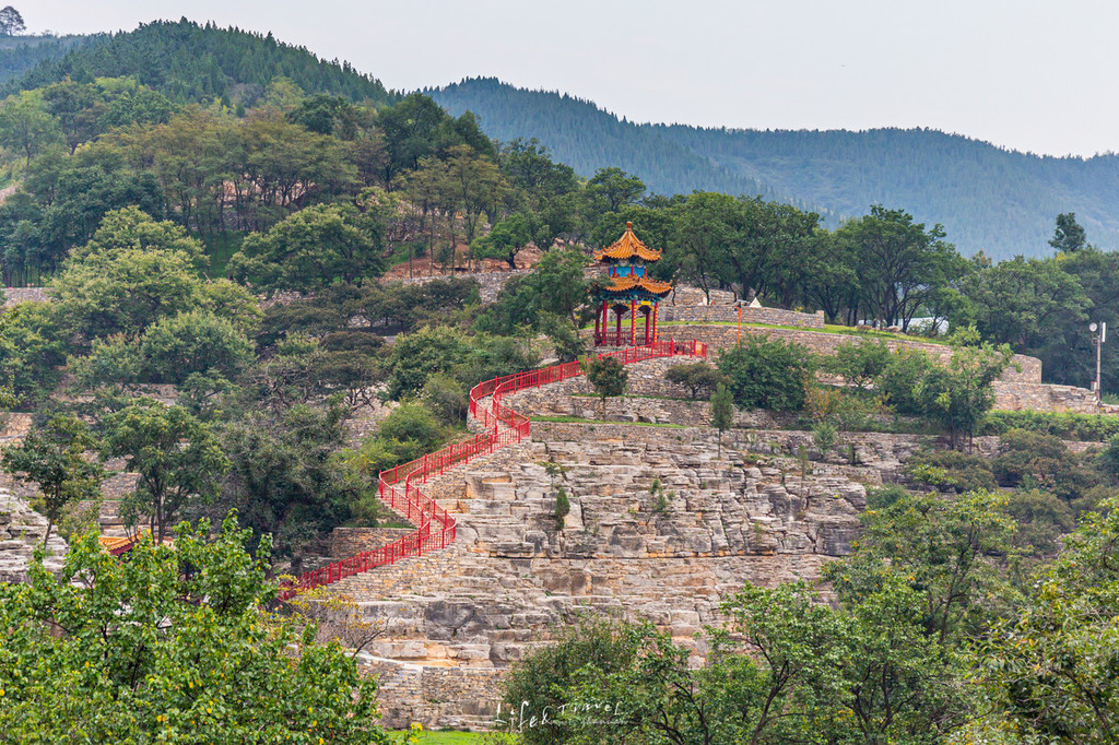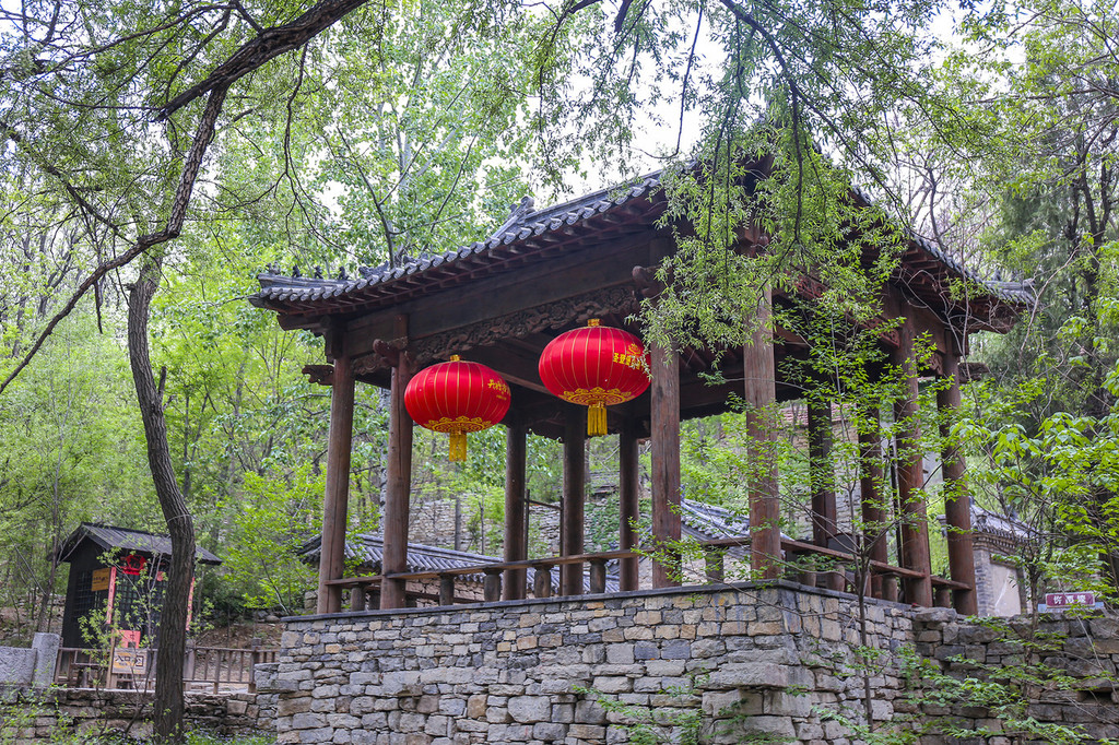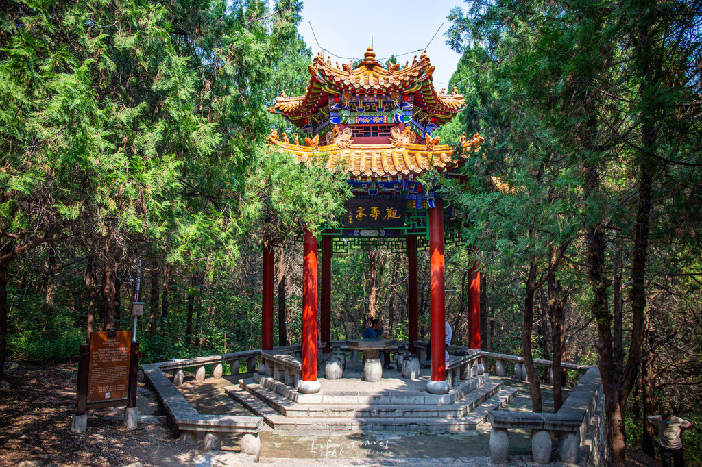 踩着台阶缓缓向上,穿过茂盛的林木,第一个值得停留的地方便是:“观寿亭”,这里也是入景区第一处可以仰观“寿”字的最佳位置,依稀可见山顶石壁上的“寿”字。