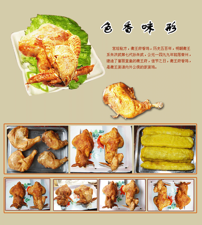 衡王府香鸡系明代衡王宴请公侯贵宾的主菜,有色、香、味、形俱佳的特点,鸡肉鲜嫩脱骨,口味独特,越嚼越香。