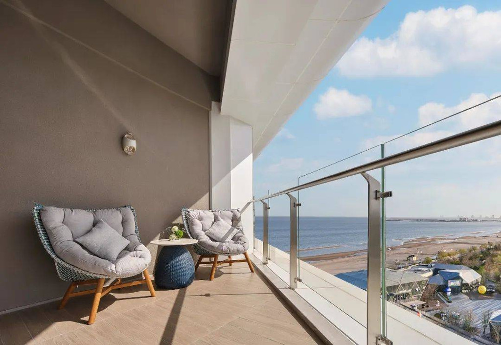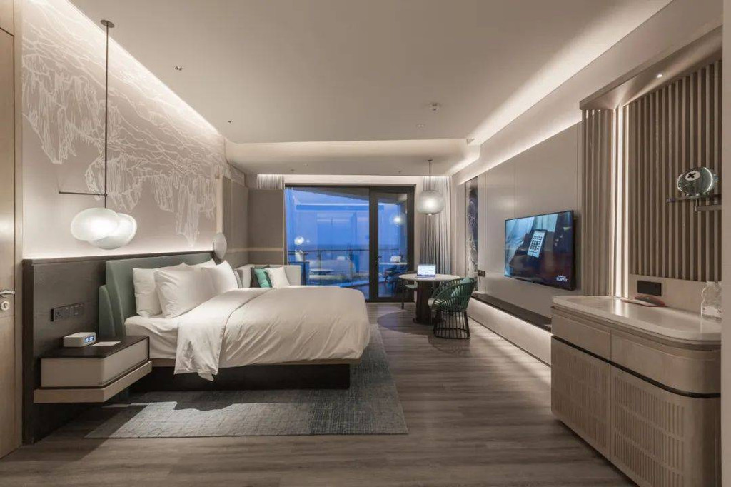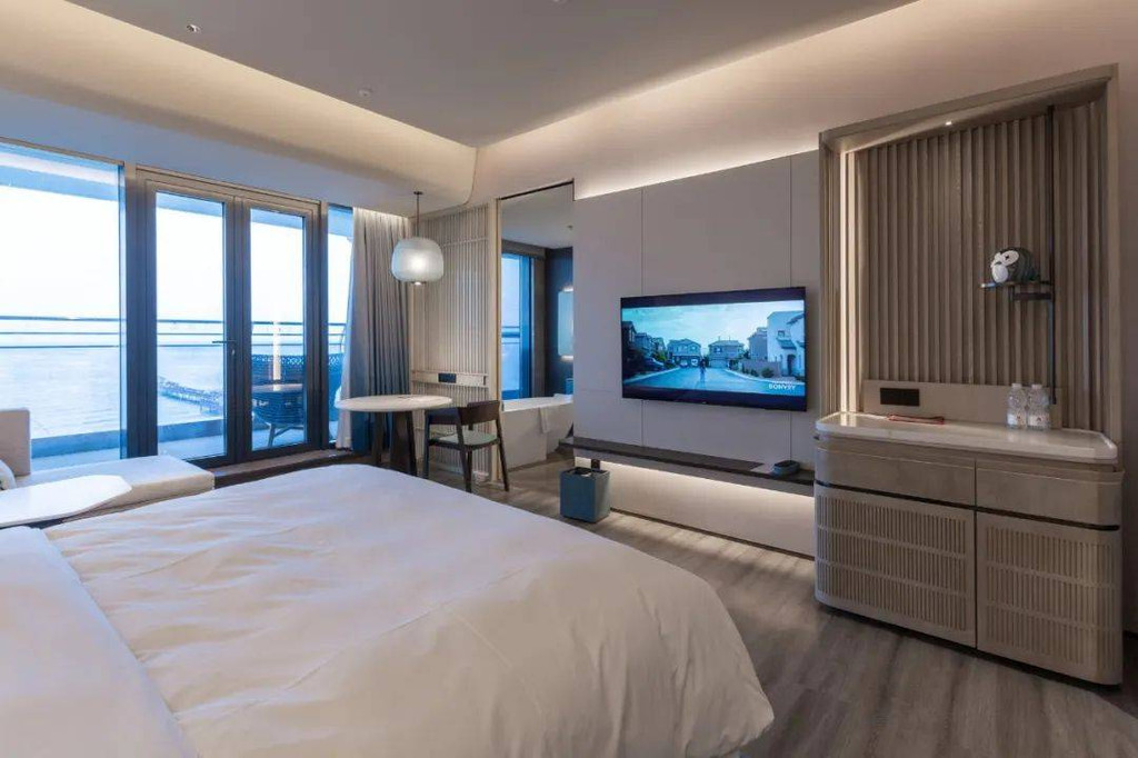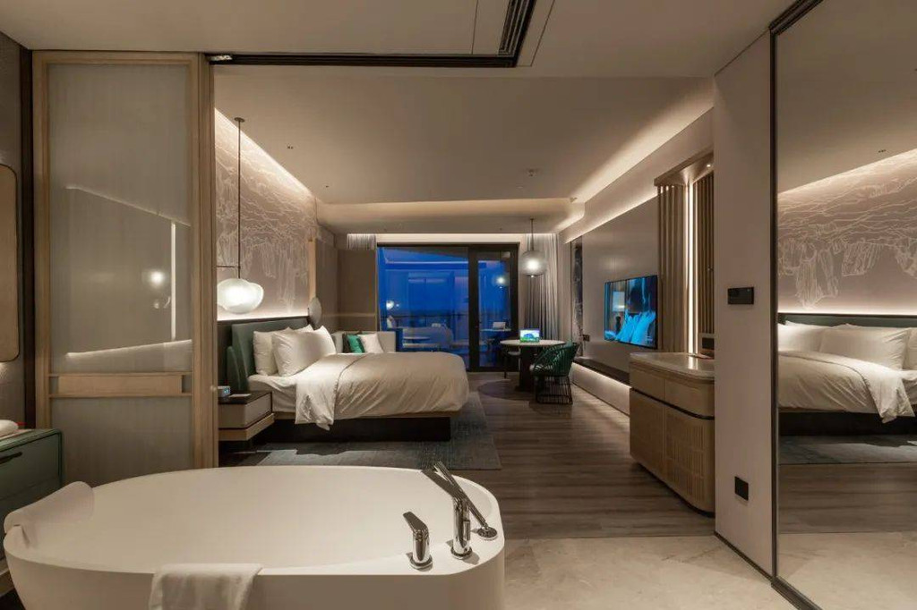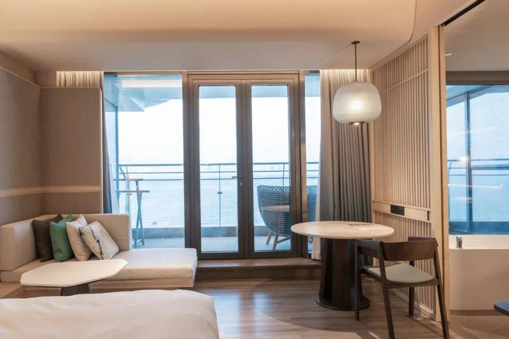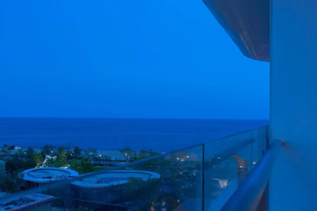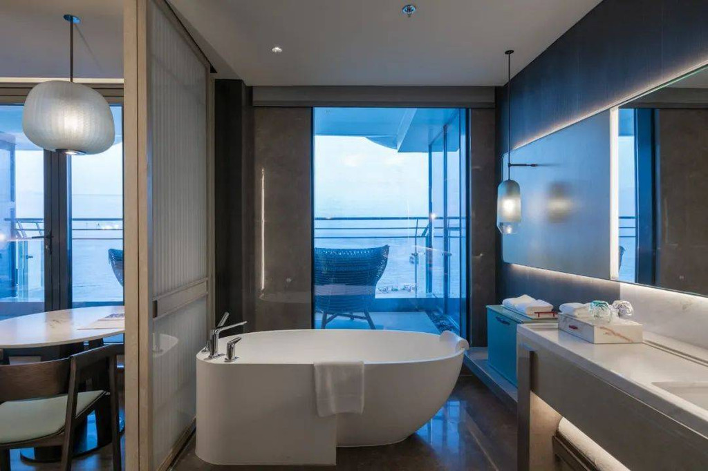 如果是入住正海景客房,宾客可在泡澡的同时,还能欣赏窗外的海景。智能窗帘一键启动,眼前便是壮阔大海,夜晚可以伴着海风、枕着海浪声入眠。