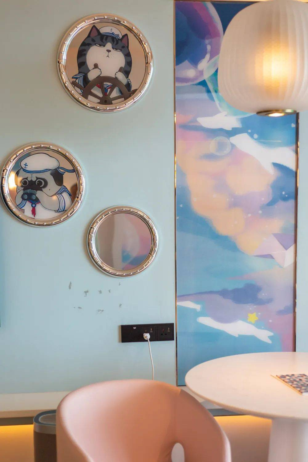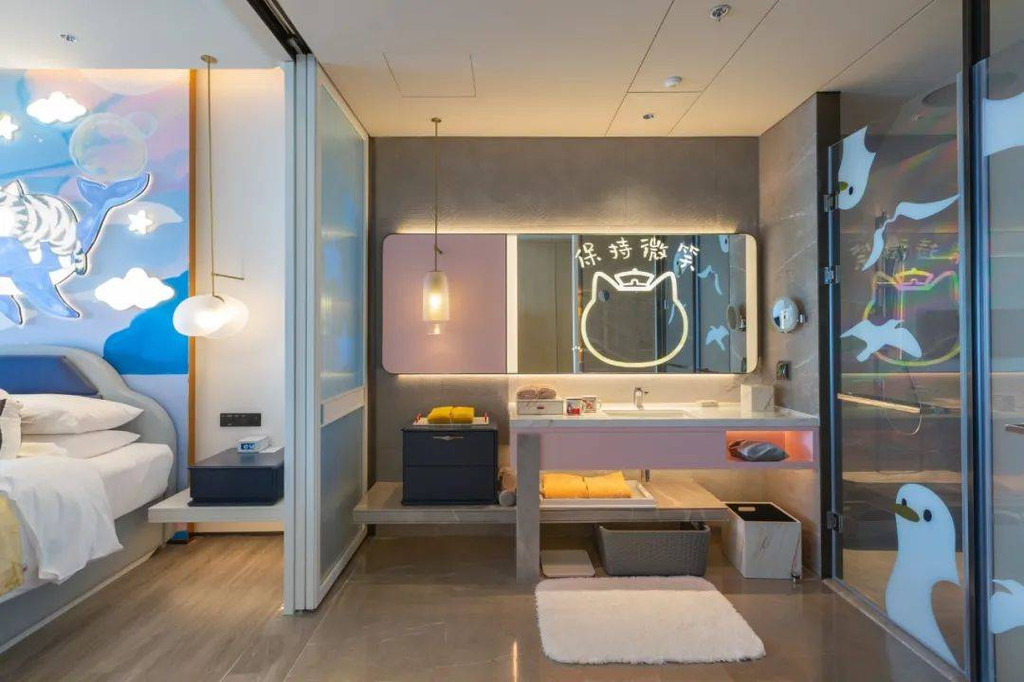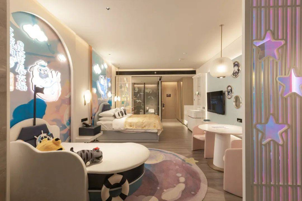 为“小公主”们准备了「你是我的掌上明珠」的主题客房,粉色的海洋世界里,彩色水母翩翩起舞,猫咪头像镜面灯,放大的贝壳小床,萌萌的猫咪和小羊,还会探出头跟你打招呼。
