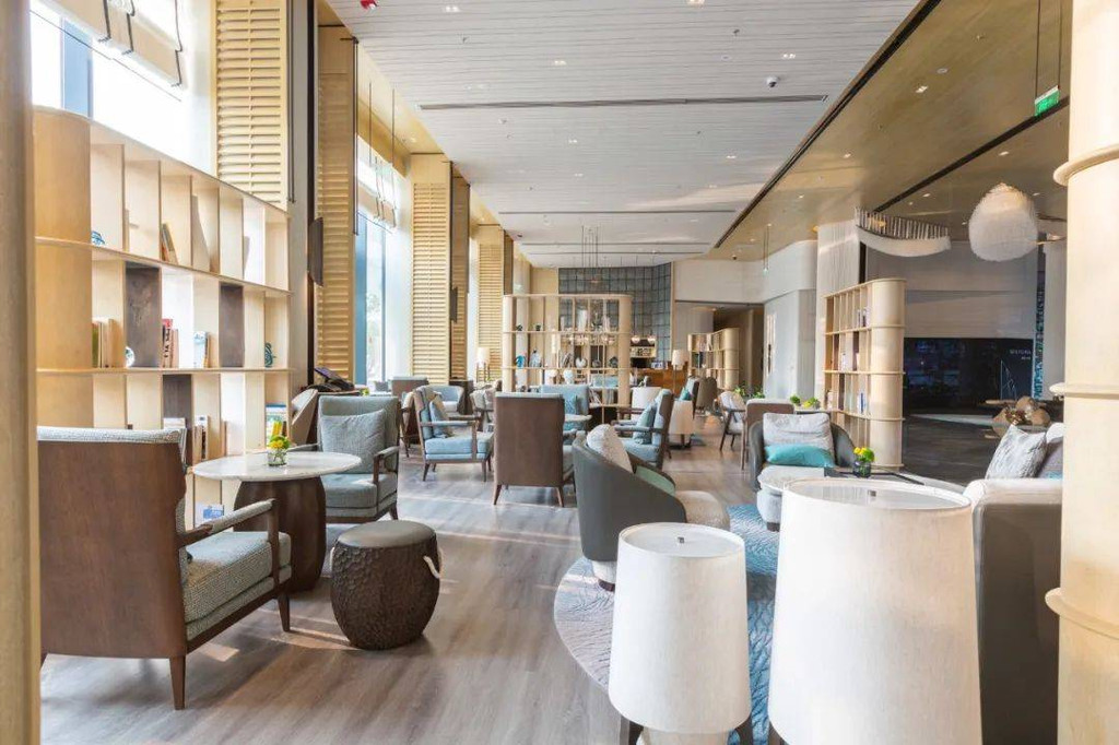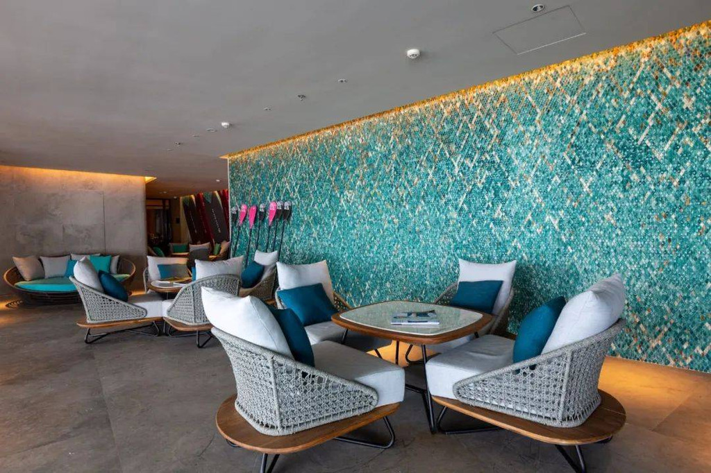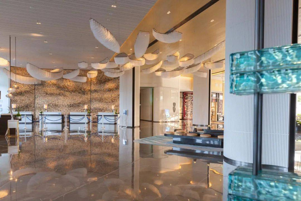 大堂设计则呼应建筑的弧形结构,以飘逸的艺术曲线营造灵动的空间质感,比如:前台海浪艺术背景墙、浮在半空中的3D“帆船”造型灯饰等,各个充满自然意向,都在营造沉浸式海洋元素氛围。